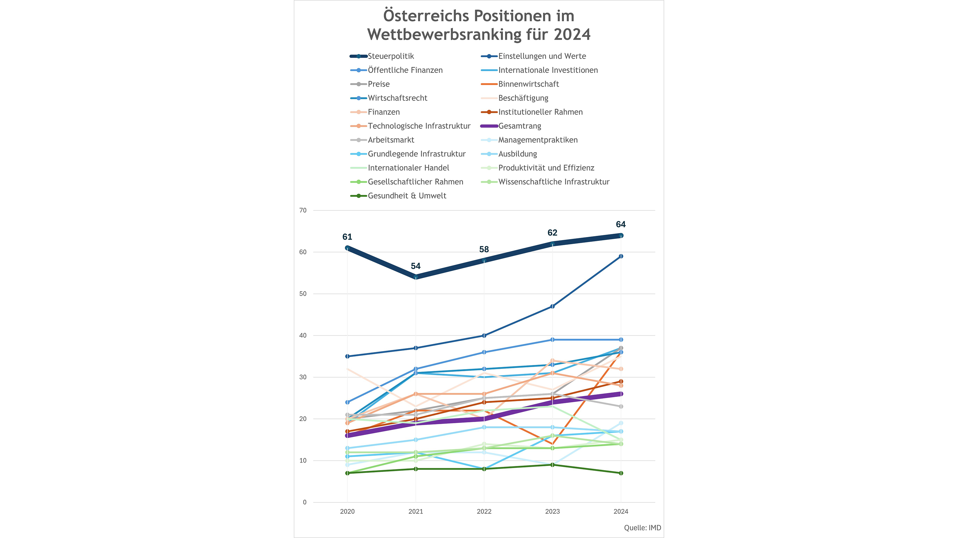 Beim IMD World Competitiveness Ranking rutschte Österreich von Platz 16 im Jahr 2020 in den letzten Jahren auf Platz 24 im Jahr 2023 ab. Deutlich am schlechtesten schneidet Österreich bei dem Punkt Steuerpolitik ab und steht bei diesem Punkt auf Platz 64 von 67 untersuchten Staaten.