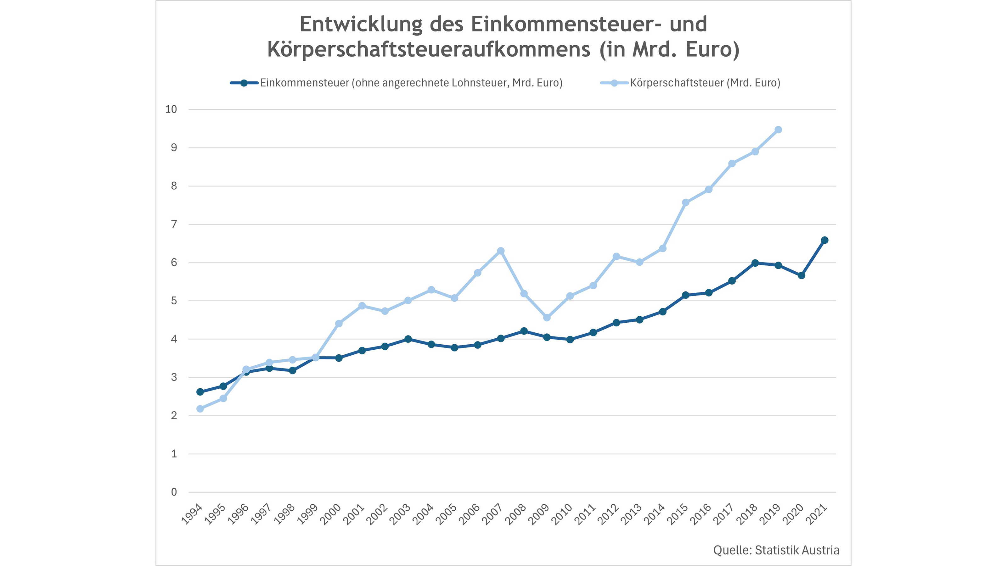 Die Körperschaftsteuer wurde in Österreich ab 2005 von 34% auf 25% gesenkt. Die erste Vermutung wäre ein Einbruch des Körperschaftsteueraufkommens. Aber weit gefehlt: Das Körperschaftsteueraufkommen ging zwar von 5,294 Mrd. Euro (2004) im ersten Jahr auf 5,073 Mrd. Euro (2005) zurück. Das heißt bei einer Reduktion der Steuerbelastung um etwa 26 Prozent ging das Steueraufkommen im ersten Jahr um 4 Prozent zurück. Bereits im Jahr 2006 (zweites Jahr nach der Reduktion) ist aber das Körperschaftsteueraufkommen auf den bis dahin höchsten Wert von 5,732 Mrd. Euro (2006) gestiegen (+ 13% gegenüber dem Vorjahr). Somit ist auf der Steueraufkommenskurve praktisch kein Einbruch zu erkennen.
