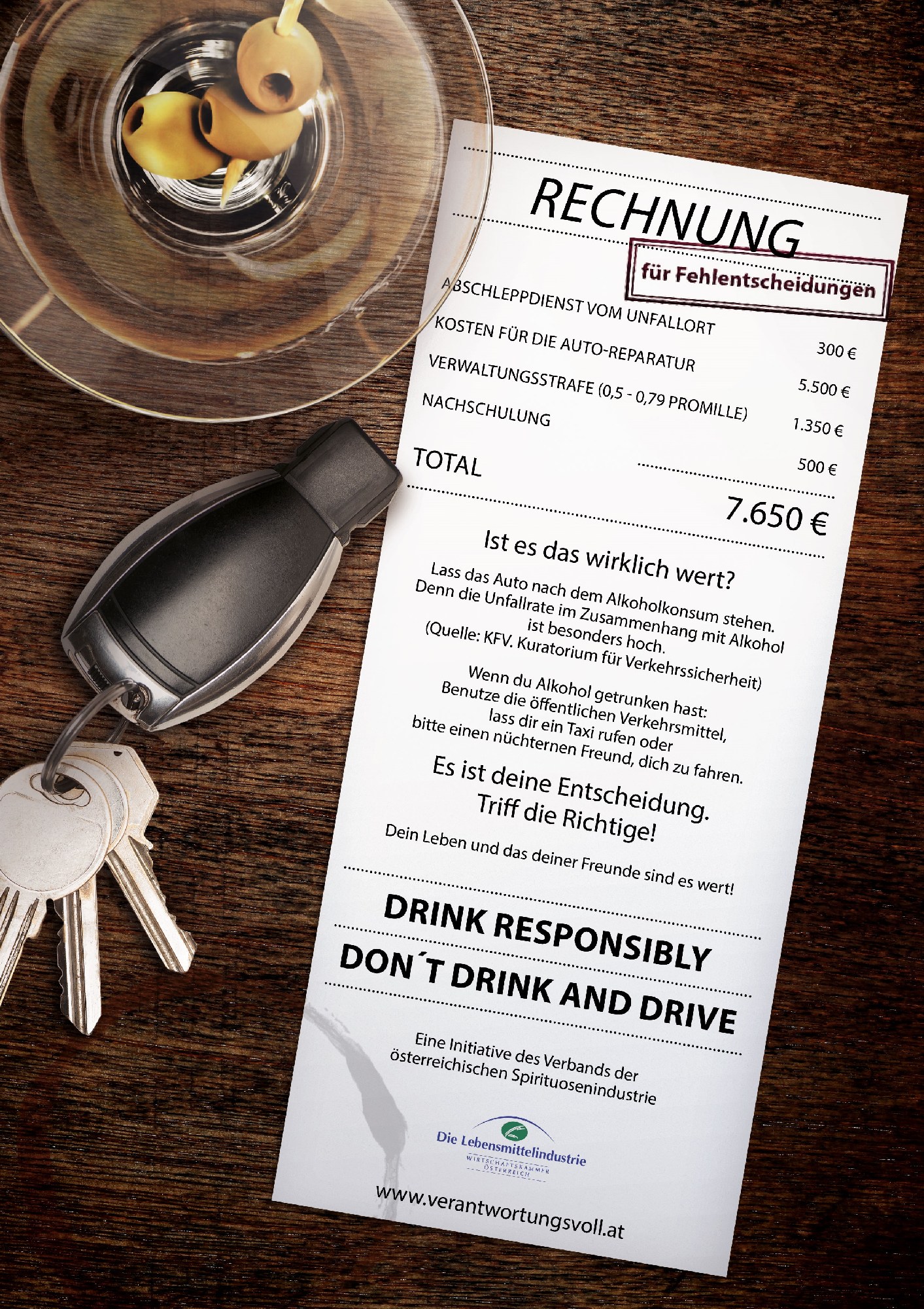 (Wien, 13.9.2017) „Wir möchten ‚Don´t Drink and Drive‘ wieder in Erinnerung rufen und auch junge Leute eindringlich erinnern, dass Alkohol und Autofahren nicht zusammenpassen", erläutert Mag. Katharina Koßdorff, Geschäftsführerin des Fachverbandes der Lebensmittelindustrie. Die österreichische Spirituosenindustrie wird daher Mitte September gemeinsam mit namhaften Gastronomiebetrieben eine neue Präventionskampagne zum Thema „Don’t Drink and Drive" starten. Die Kampagne wird vom Verband gelauncht. In den nächsten Monaten erhalten die Gäste ausgewählter Gastronomieunternehmen in ganz Österreich zusätzlich zu ihrem üblichen Rechnungsbeleg eine „zweite" Rechnung. Diese informiert über die möglichen Kosten einer alkoholisierten Fahrt mit Unfallfolge. Auch Flyer und Poster werden aufliegen.