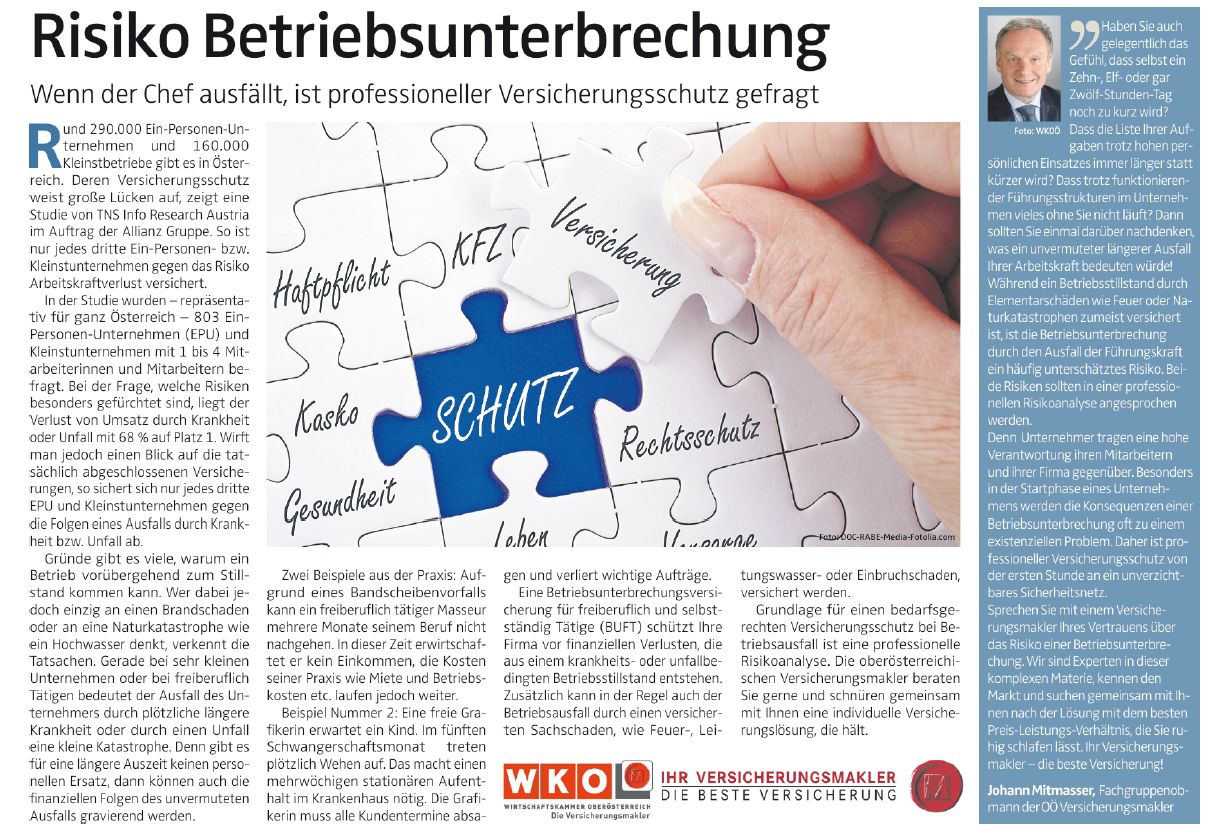Unsere Artikel können gerne für Werbezwecke verwendet werden. Bitte geben Sie bei Verwendung folgende Quelle an: WKOÖ/Fachgruppe Versicherungsmakler und Berater in Versicherungsangelegenheiten