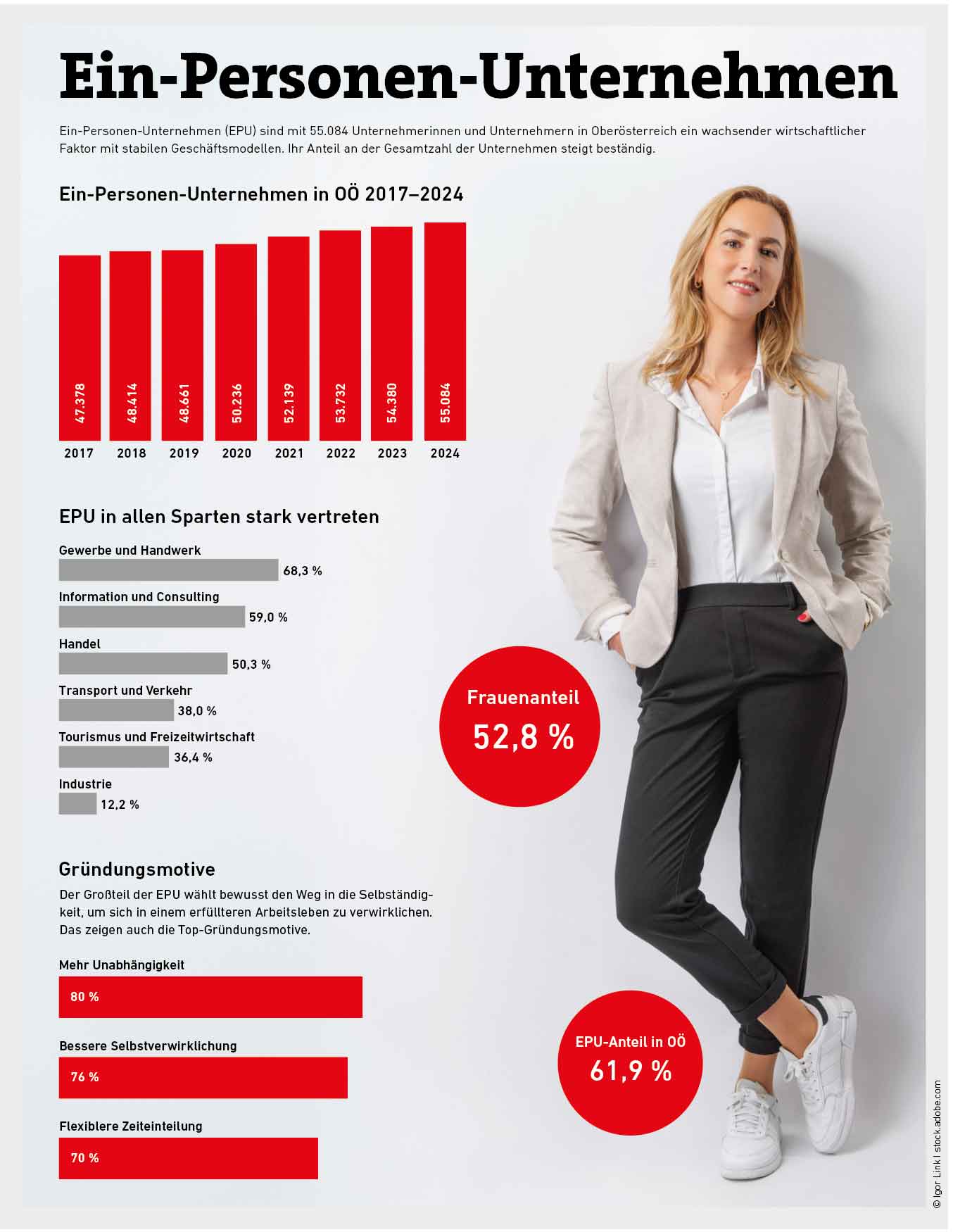 Oberösterreichs Ein-Personen-Unternehmen setzen ihren Wachstumskurs fort. Mit einem Plus von 1,3 Prozent im Vergleich zum Vorjahr sind nun insgesamt 55.084 EPU in Oberösterreich aktiv, sie machen damit rund 62 Prozent aller Unternehmen im Bundesland aus. „Jedes einzelne EPU trägt wesentlich zur wirtschaftlichen Dynamik und zur regionalen Stärke bei“, so WKOÖ-Präsidentin Doris Hummer.