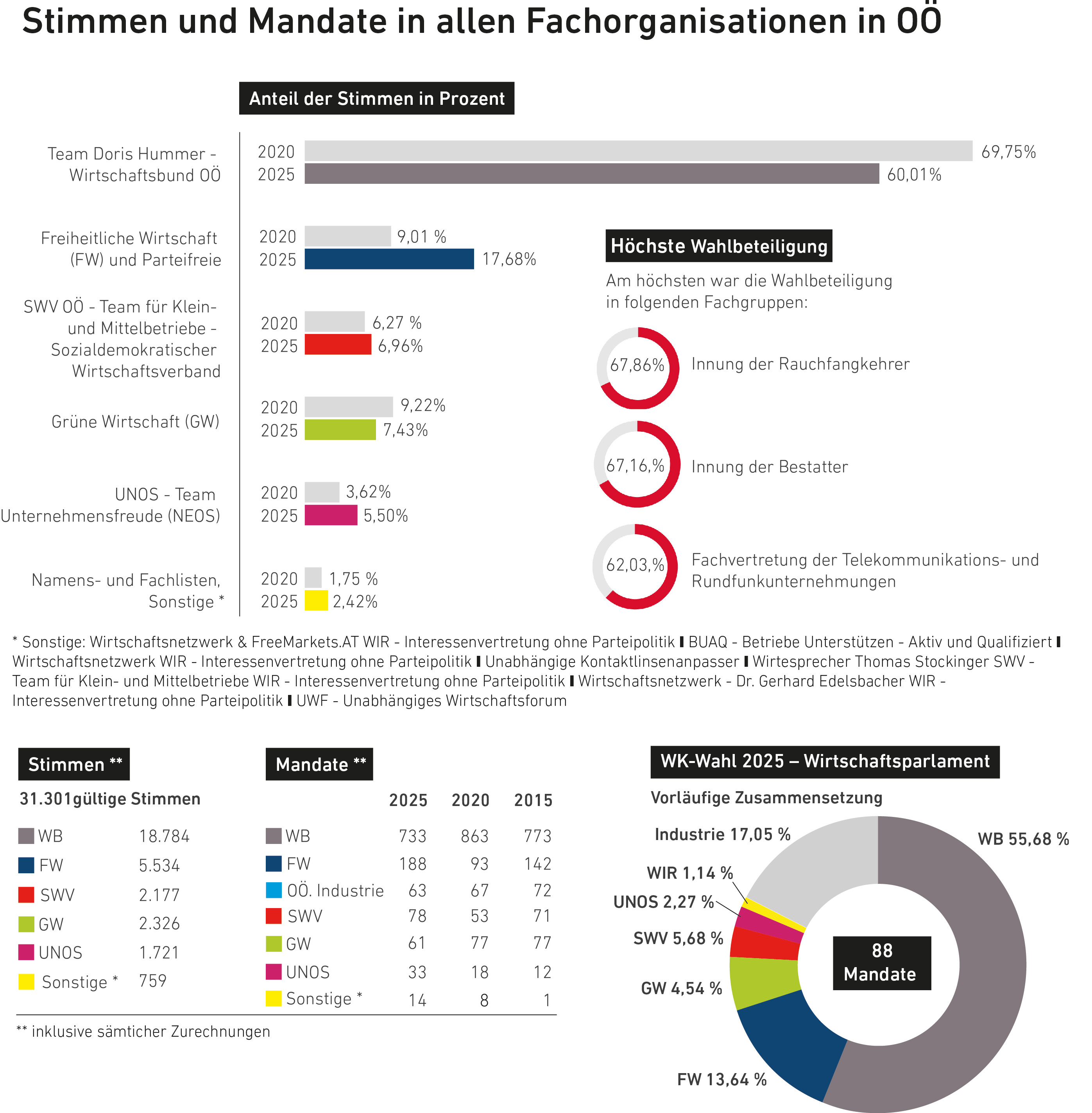Nach dem nunmehrigen Ende der WK-Wahlen 2025 erfolgt in Oberösterreich am 4. Juni im Wirtschaftsparlament die offizielle Wahl des neuen WKOÖ-Präsidiums. Für diese Wahl ist die dortige Mandatsverteilung ausschlaggebend. Ausgehend von den erreichten Urwahlmandaten besetzen die jeweiligen Wählergruppen dementsprechend viele Spartenvertretungsmandate.