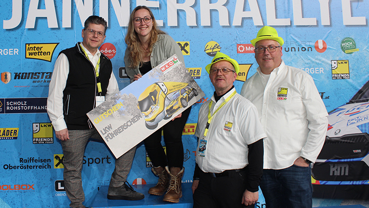 Ebenfalls in Unterweitersdorf beheimatet ist eine weitere „JännerRallye-Gewinnerin“. Die 26-jährige Celina Geisberger wurde von Trucker-Babe Patricia Altmann aus Kremsmünster als Siegerin des Friends-on-the-Road-Gewinnspiels gezogen. „Das kommt mir mehr als gelegen“, jubelt die engagierte Jung-Feuerwehrfrau über eine kostenlose C-Führerschein-Ausbildung zur Lkw-Lenkerin. Gratuliert haben dazu neben JännerRallye-Sieger Michael Lengauer auch WKOÖ-Vizepräsident Leo Jindrak, Transporteure-Obmann Günther Reder und seine beiden Stellvertreter Michael Hofstädter und Hubert Schlager.