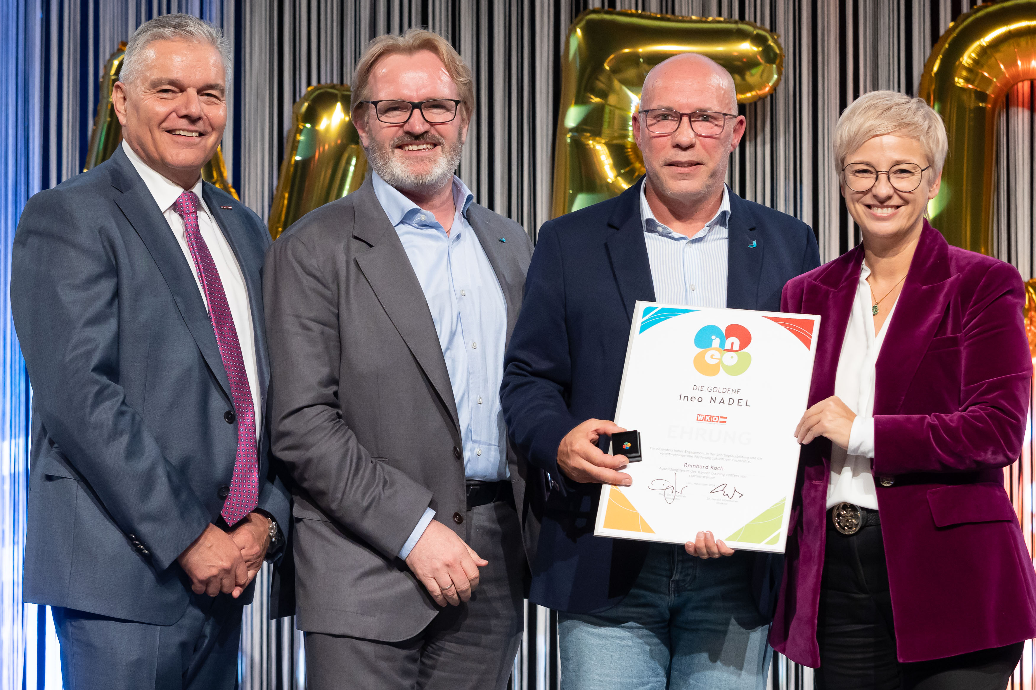 Erstmals gab es heuer eine Sonderehrung für herausragendes Engagement in der Lehrlingsausbildung. Diese Auszeichnung wurde an Reinhard Koch, Ausbildungsleiter des sterner training centers von starlim-sterner, und an Werner Grubmüller, Ausbildungskoordinator im Ausbildungszentrum Linz der voestalpine AG, verliehen. Als Dankeschön für ihr jahrzehntelanges Wirken rund um die Lehrlingsausbildung in Oberösterreich bekamen sie von WKOÖ-Präsidentin Doris Hummer und WKOÖ-Vizepräsident Leo Jindrak die goldene ineo-Nadel überreicht.