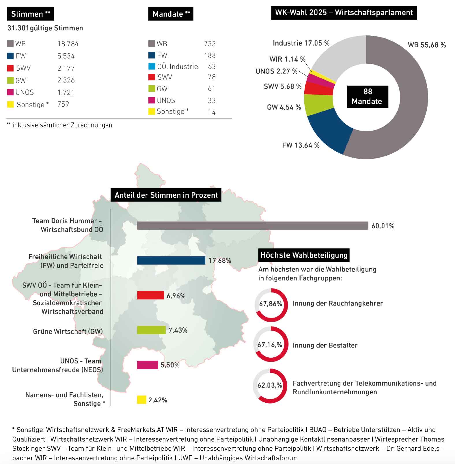 Nach dem nunmehrigen Ende der WK-Wahlen 2025 erfolgt in Oberösterreich am 4. Juni im Wirtschaftsparlament die offizielle Wahl des neuen WKOÖ-Präsidiums. Für diese Wahl ist die dortige Mandatsverteilung ausschlaggebend. Ausgehend von den erreichten Urwahlmandaten besetzen die jeweiligen Wählergruppen dementsprechend viele Spartenvertretungsmandate.