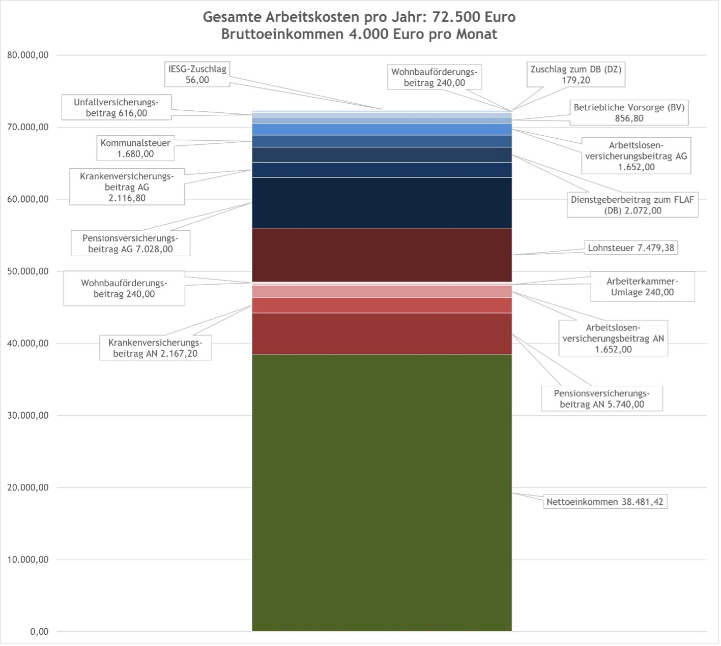 Österreich liegt bei der Steuer- und Abgabenbelastung auf Arbeit von 38 OECD-Staaten mit rund 47,2 Prozent an 3. Stelle, der OECD-Schnitt liegt bei 34,8 Prozent (OECD Taxing Wages 2024). Dieser „Abgabenkeil“ ist die Differenz zwischen den Arbeitskosten des Arbeitgebers und dem Nettoverdienst des oder der Beschäftigten. Dies bedeutet, dass der Arbeitnehmerin oder dem Arbeitnehmer von 1 Euro an Arbeitskosten netto nur 53 Cent verbleiben, 47 Cent müssen abgeführt werden. Nachfolgendes Beispiel veranschaulicht die Zusammensetzung der gesamten Arbeitskosten bei einem Bruttogehalt von 4.000 Euro pro Monat: