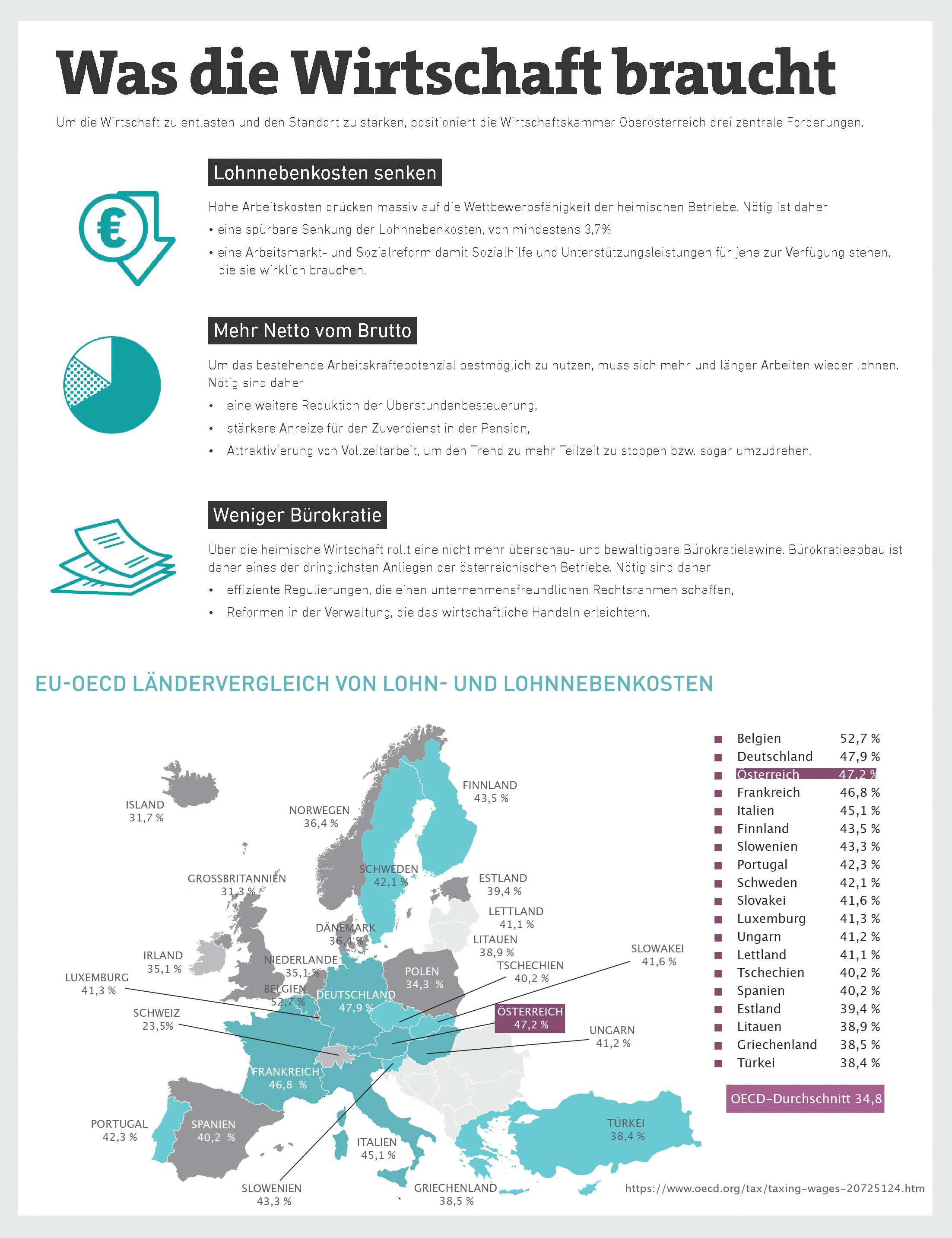 Die hohen Kosten auf Arbeit sowie der Bürokratieaufwand werden zu einem immer stärkeren Bremsschuh für die Wirtschaft. Wenn es wieder aufwärts gehen soll, wird die Politik einen starken Schwerpunkt auf die Themen Entlastung und Leistung legen müssen.