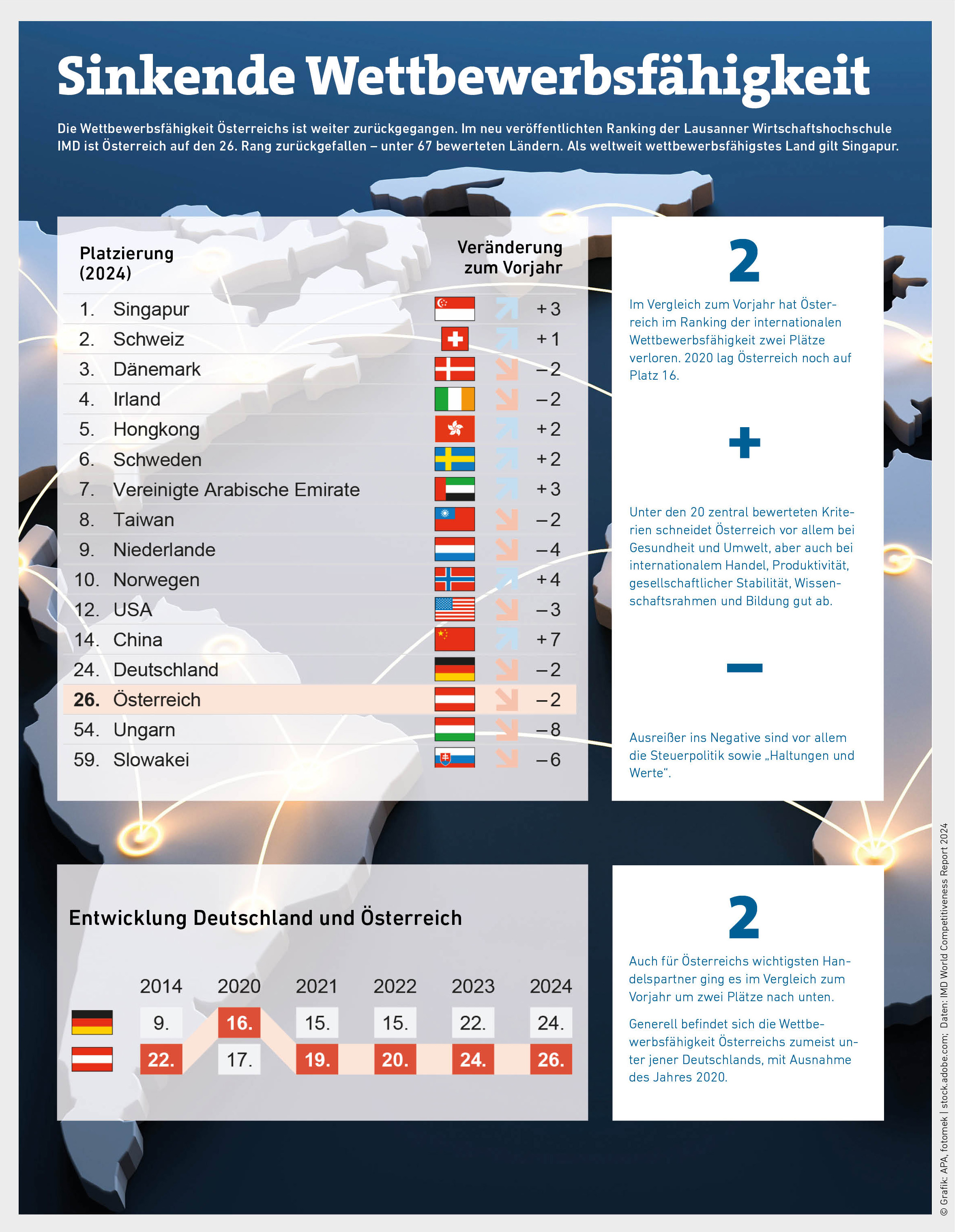 Dass Österreich im internationalen IMD-Ranking erneut um zwei Plätze nach unten gerutscht ist, ist schmerzlich, aber umso mehr Grund, jetzt wirklich in die Gänge zu kommen um wieder aufzuholen. Eine gute Wettbewerbsfähigkeit ist für uns alle von zentraler Bedeutung, denn sie bestimmt langfristig den Wohlstand unserer Gesellschaft.