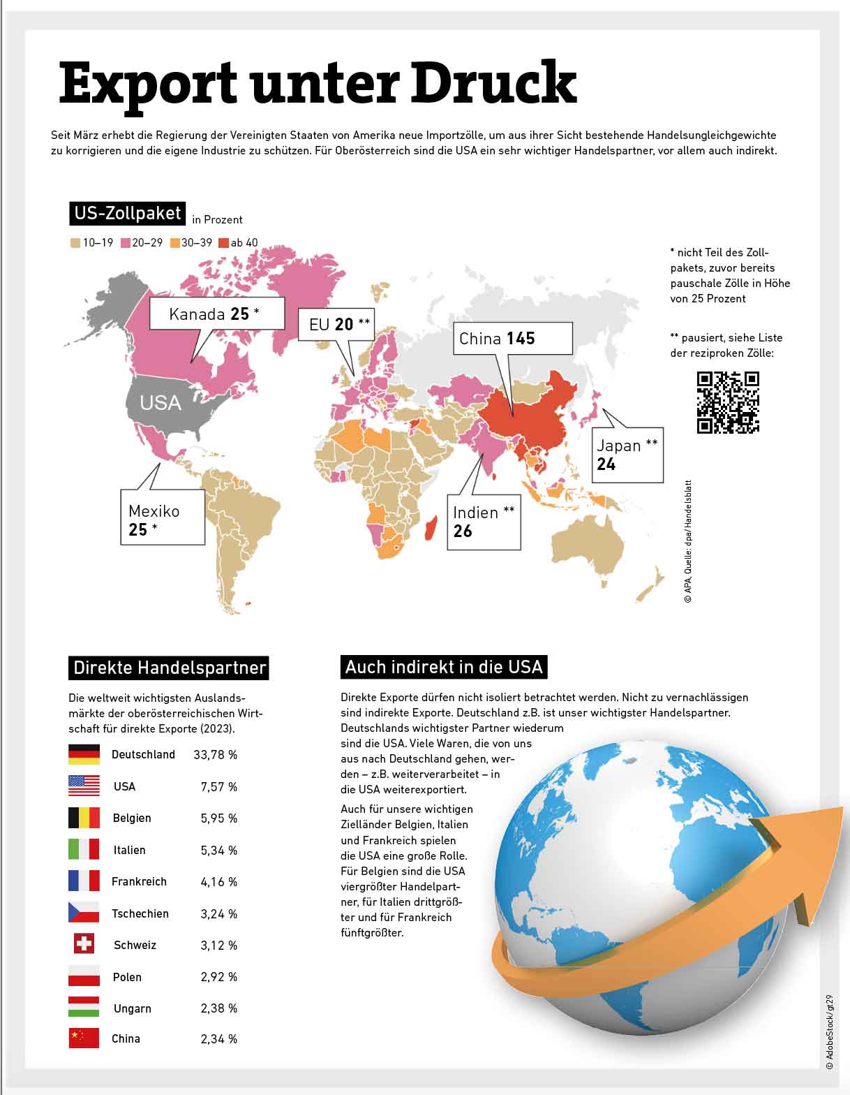 Während Österreich im dritten Rezessionsjahr steckt und „ganz nebenbei“ auch einen Staatshaushalt sanieren muss, bringt US-Präsident Donald Trump die Weltwirtschaft zusätzlich unter Druck. Die Unberechenbarkeit der Zollpolitik sorgt auch in Österreichs Wirtschaft für Unsicherheit, zumal die USA eine gewichtige Rolle für die Exportbetriebe spielen, vor allem in Oberösterreich. Besonders betroffen ist die Industrie und dies auch indirekt durch US-Zölle, die gegen andere Handelspartner wie Mexiko, Kanada oder Japan verhängt wurden.