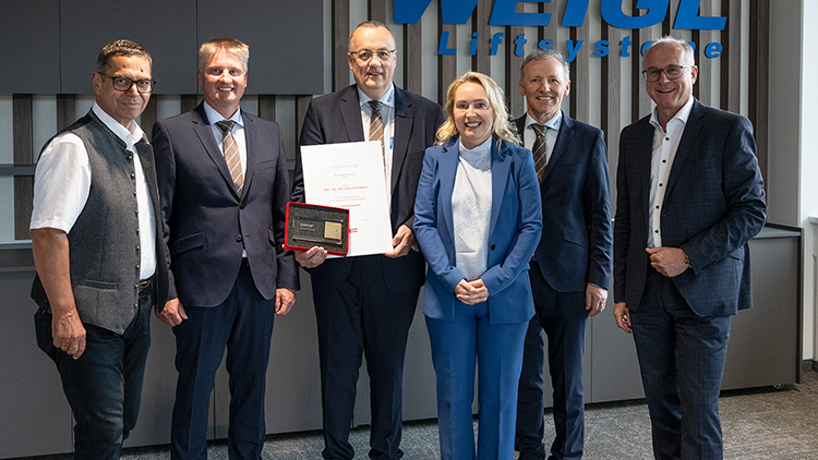 Johann Steinbock, Mitglied der Geschäftsführung von der Firma Weigl Liftsysteme in Waizenkirchen, wurde mit der Wirtschaftsmedaille und Ehrenurkunde der WKOÖ ausgezeichnet.