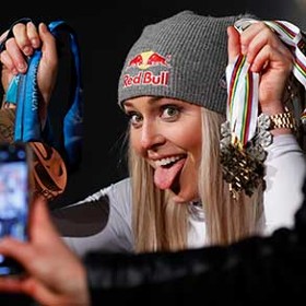 Lindsey Vonn mit allen jemals von ihr gewonnenen Medaillen während ihrer Abschiedspressekonferenz in Åre