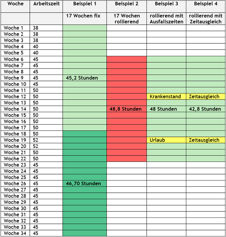 - In jedem beliebigen 17-Wochenzeitraum sind die 48 Stunden Höchstarbeitszeit einzuhalten (z.B. 1. – 17. Kalenderwoche, 2. – 18 Kalenderwoche, 3. – 19. Kalenderwoche etc.). Fixe Zeiträume sind nicht mehr zulässig.