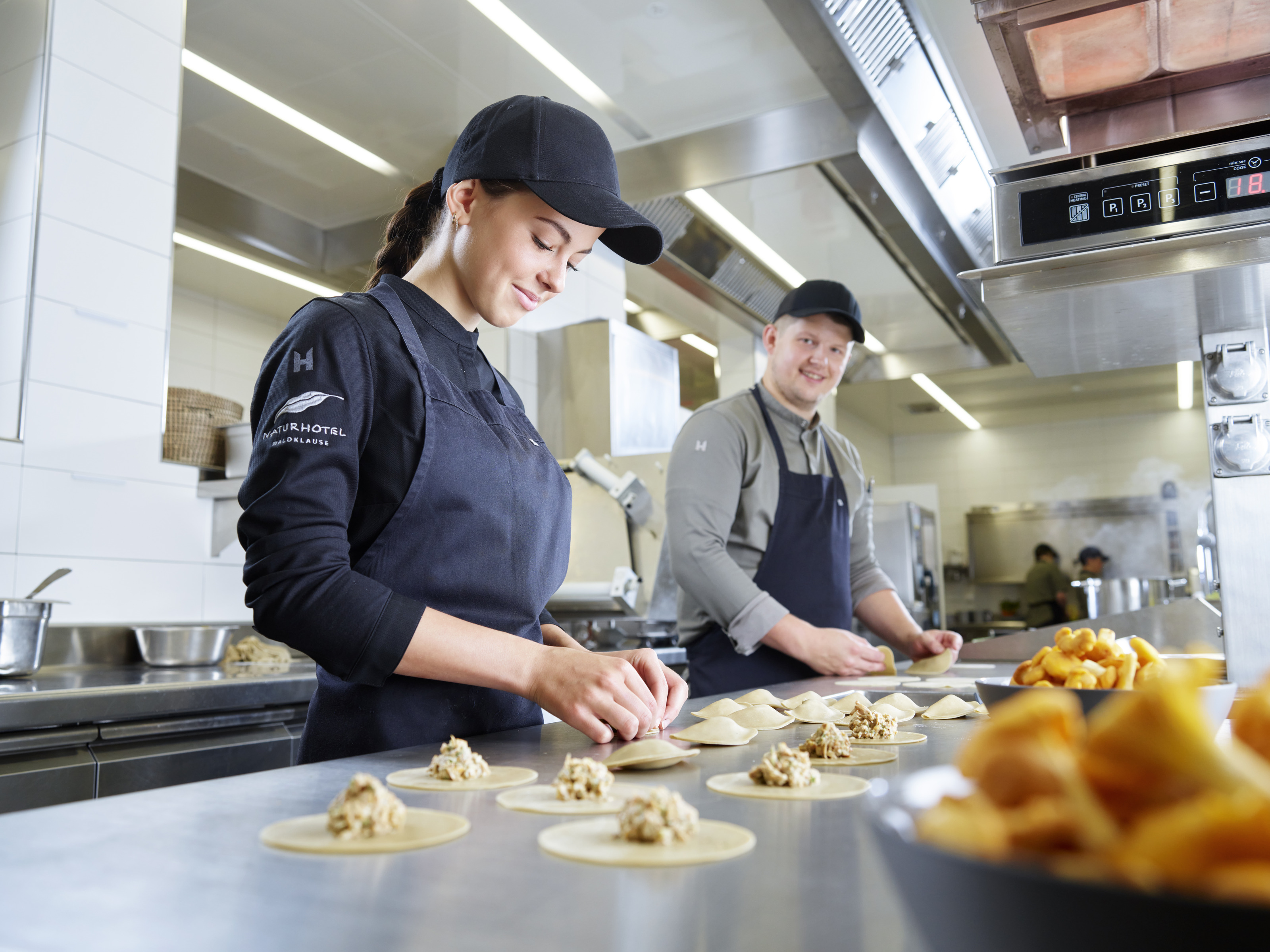Zwei sanft lächelnde Personen mit Caps und in Schürzen stehen in großer Edelstahlküche und befüllen Teigtaschen, ringsum Küchenutensilien und Schüsseln mit Eierschwammerl
