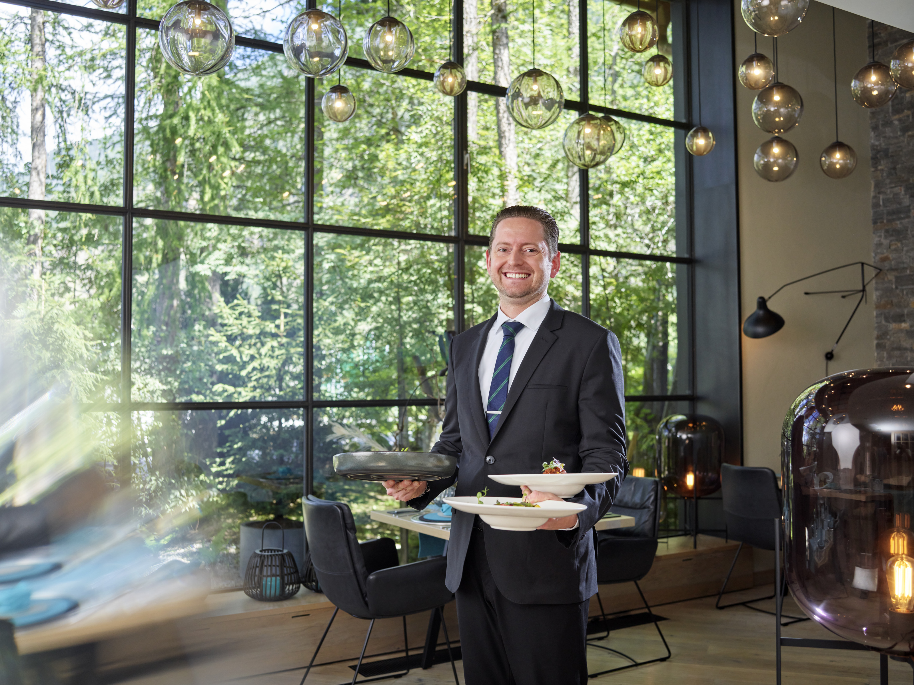 Lächelnde Person in schwarzem Anzug, weißem Hemd und gestreifter Krawatte hält drei Teller mit Speisen in Händen, im Hintergrund großes Glasfenster, ringsum gedeckte Tische, vom Plafond Lichtkugeln hängend