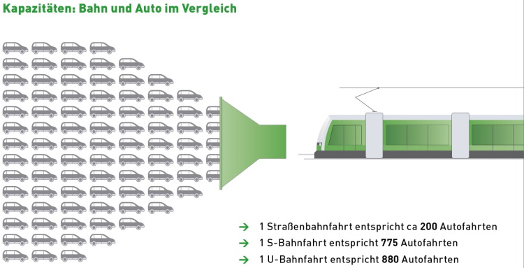 Der innerstädtische Schienenverkehr ist nicht nur umweltverträglicher als der Individualverkehr, sondern trägt auch dazu bei, Staus zu verringern. Pro Stunde können um ein Vielfaches mehr an Personen mit S-Bahn, U-Bahn und Straßenbahn fahren, als mit dem eigenen Auto.