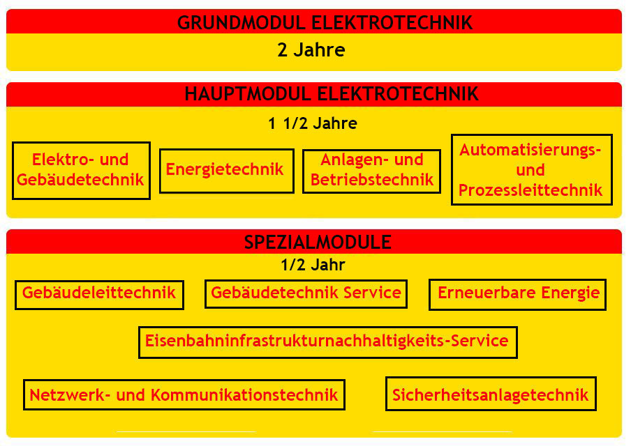Die Berufsausbildung Elektrotechnik ist ein Modullehrberuf. Die Lehre besteht aus einem zweijährigen Grundmodul, einem Hauptmodul über eineinhalb Jahre – wahlweise in Elektro- und Gebäudetechnik, Energietechnik, Anlagen- und Betriebstechnik oder Automatisierungs- und Prozessleittechnik – und einem von 11 freiwilligen Spezialmodulen über ein weiteres halbes Jahr.