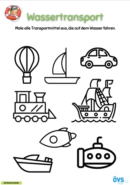Male alle Transportmittel aus, die auf dem Wasser fahren.