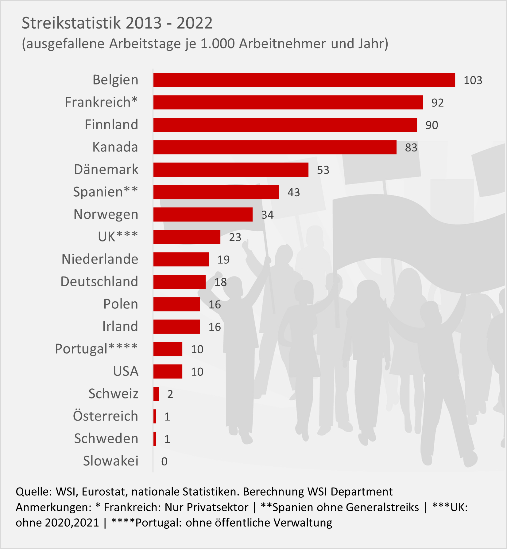 - STATISTA: https://de.statista.com/statistik/daten/studie/384248/umfrage/jaehrlich-durch-streiks-ausgefallene-arbeitstage-nach-laendern/