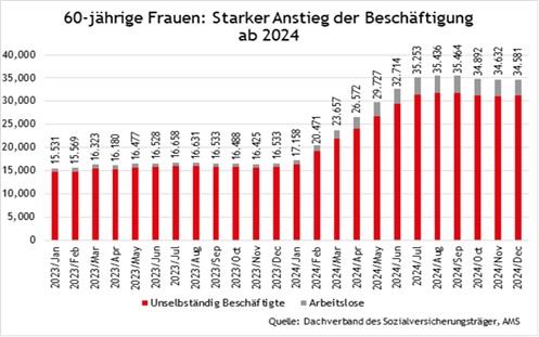 Zwar ist auch die Zahl der arbeitslosen Frauen über 60 Jahre gestiegen: Aber 85 % der zusätzlichen weiblichen Erwerbspersonen sind in Beschäftigung, nur 15 % entfallen auf Arbeitslosigkeit. Dazu passt, dass laut AMS zuletzt 76 % der Pensionsantritte von Frauen aus Beschäftigung und nur 6,8 % aus Arbeitslosigkeit heraus erfolgten.