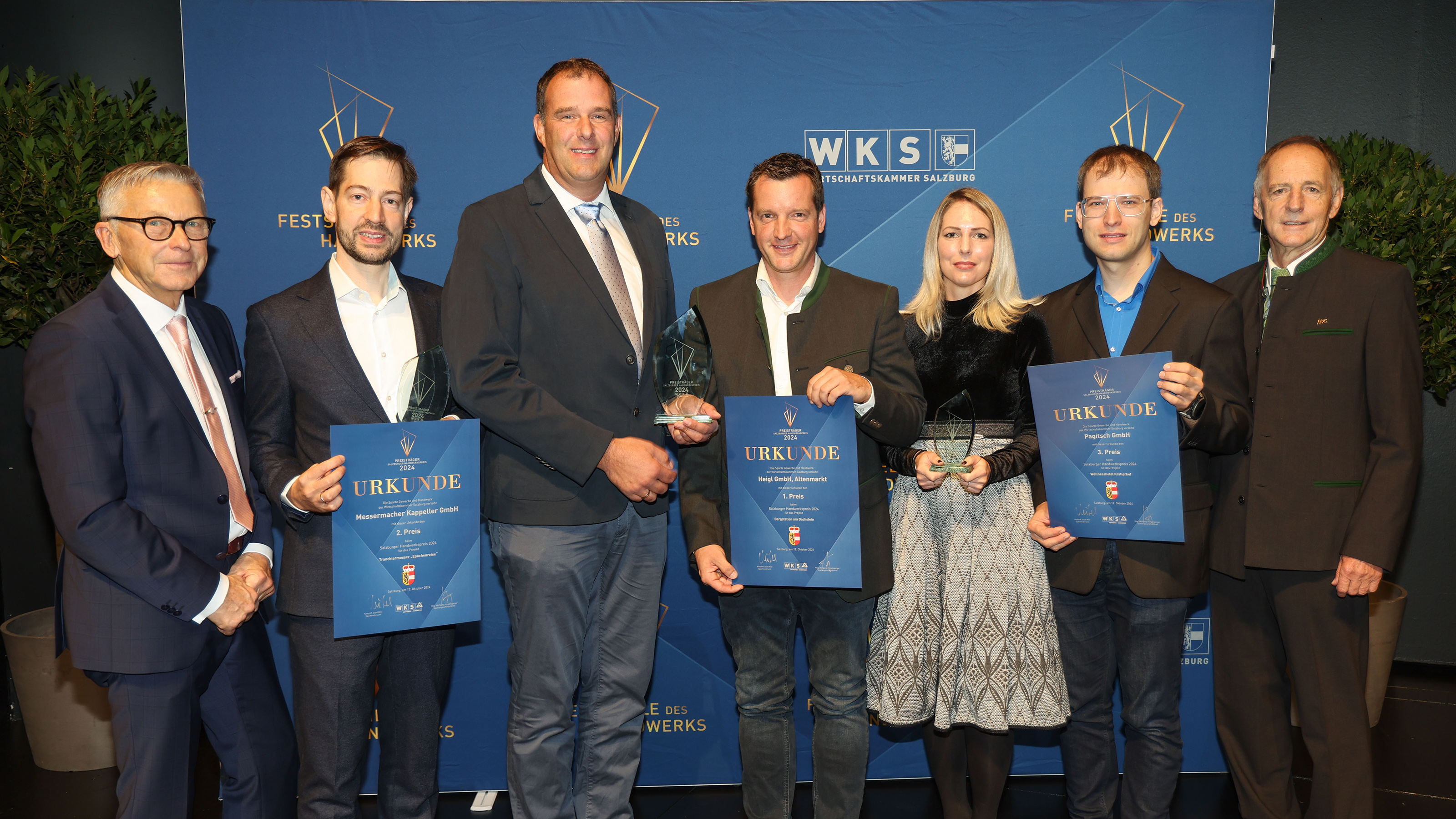 Als einer der Höhepunkte der Meisterbriefverleihung fand zudem die Prämierung der Gewinner des „34. Salzburger Handwerkspreises“ der WKS statt. Zum Siegerprojekt wurde die Heigl GmbH aus Altenmarkt für die Dachdecker- und Spenglerarbeiten bei der Bergstation „Energiekristall“ am Dachstein gekürt. Den zweiten Platz belegte Messermacher Richard Kappeller aus Salzburg mit seinem Tranchiermesser „Epochenreise“. Den dritten Platz holte sich die Pagitsch GmbH aus Tamsweg für die Trockenbauarbeiten beim Wellnesshotel Krallerhof. Darüber hinaus wurden drei Anerkennungspreise vergeben: An die Tischlerei Johannes Seidl in Kuchl für das Raumsparwunder „Roomflapper“, die Stockinger & Reinthaler Bau GmbH in Wals-Siezenheim für die Revitalisierung eines historischen Hauses in Salzburg sowie an Instrumentenbauer Tobias Falkner aus Scheffau für seine mehrheitlich handgefertigte Basstrompete.