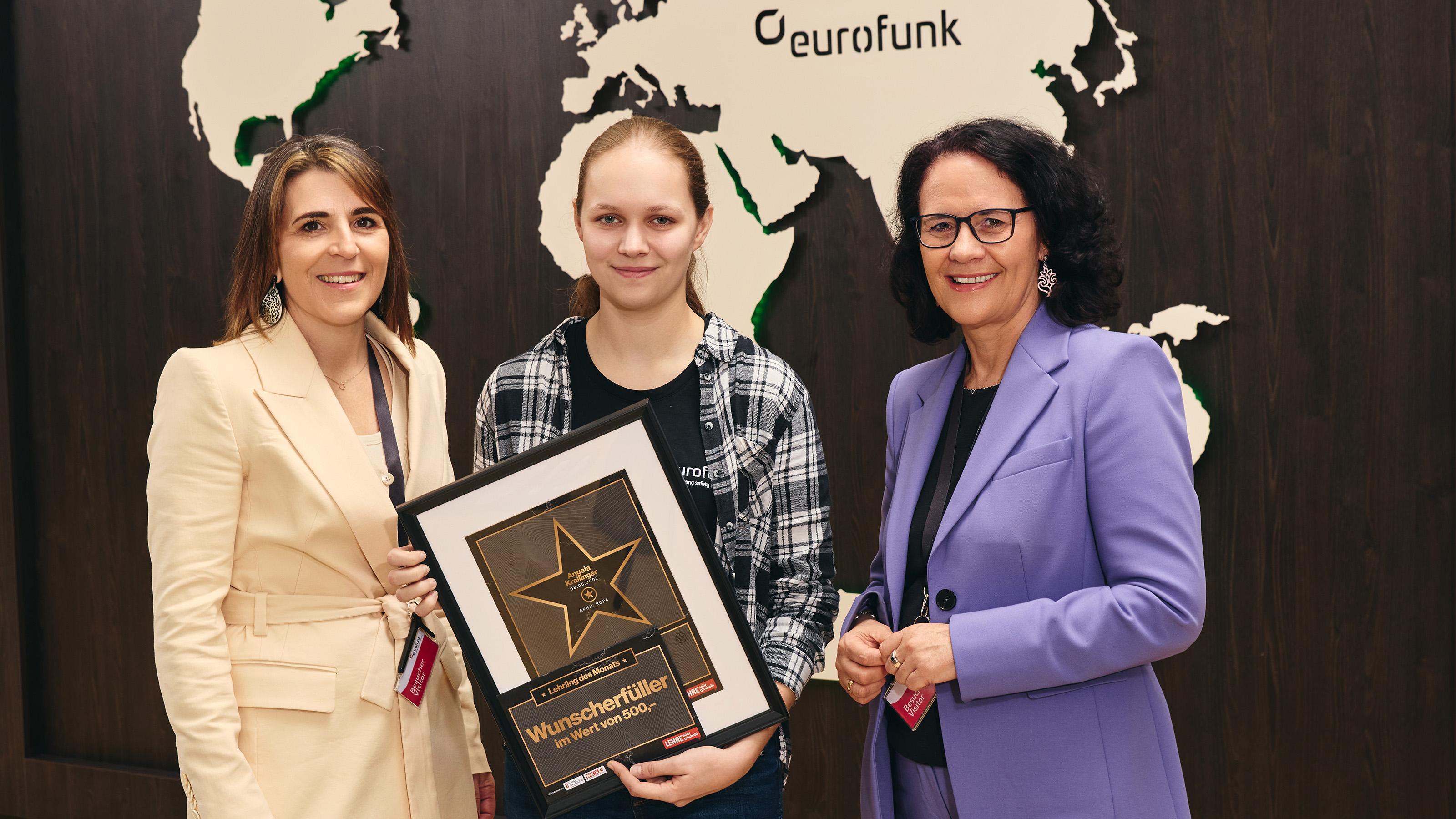 Foto 1: Martina Plaschke (WKS), Lehrling Angela Krallinger und Landesrätin Daniela Gutschi bei der Auszeichnung zum „Lehrling des Monats April“ (v. l.).