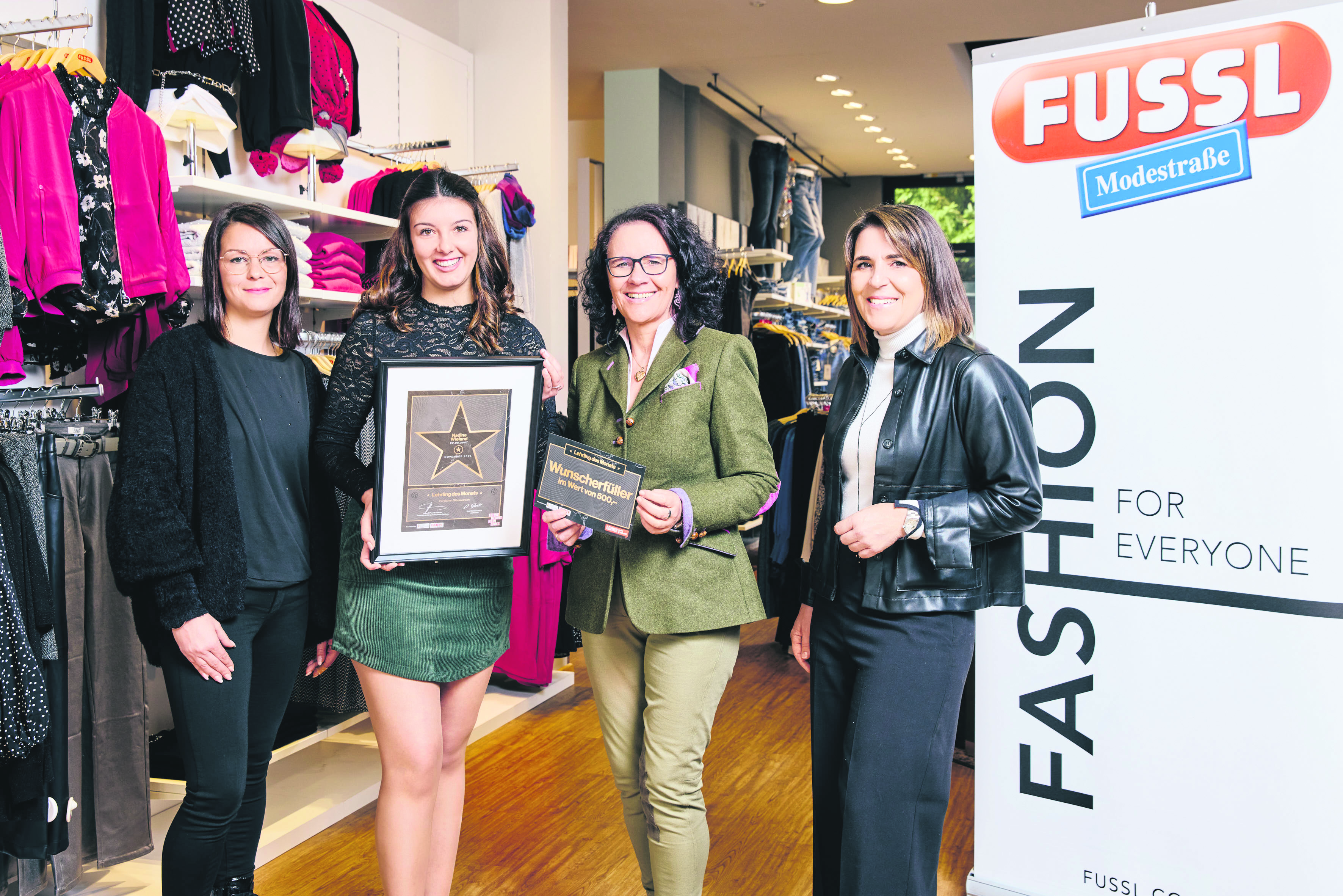 Bild 1: Einzelhandelskauffrau Nadine Wieland (2. v. l.) ist „Lehrling des Monats November“. Es gratulierten (v. l.): Bettina Bobnar (Fussl Modestrasse Mayr GmbH), Landesrätin Daniela Gutschi und Martina Plaschke (WKS). Foto: WKS/Hechenberger