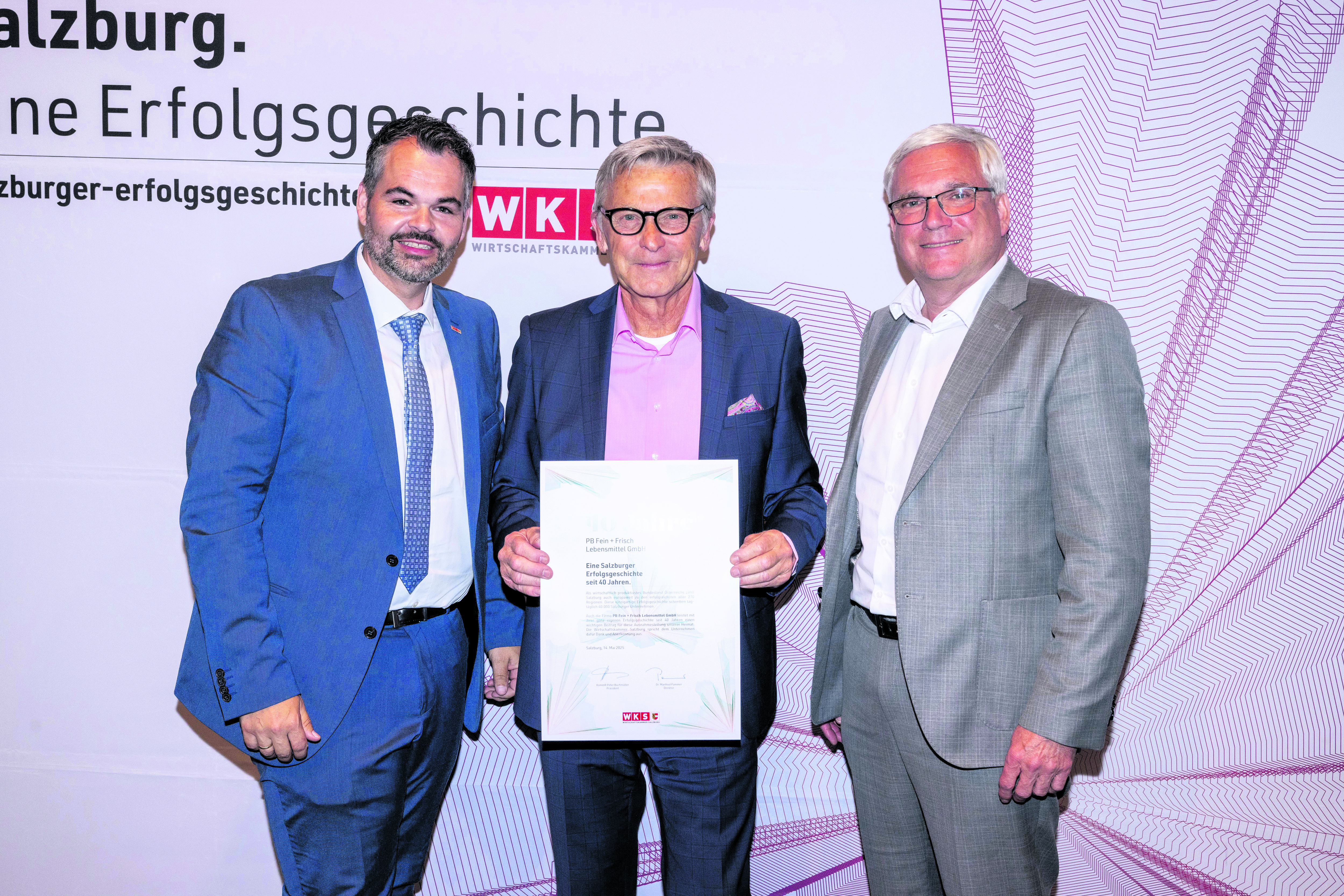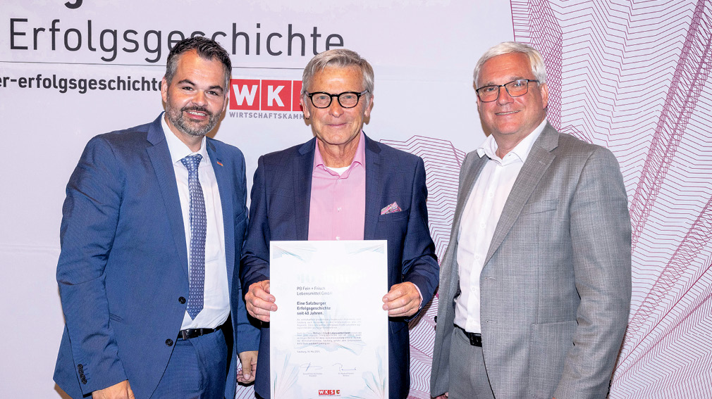Als besonderer Höhepunkt der Veranstaltung wurde WKS-Präsident Peter Buchmüller für sein 40-jähriges Jubiläum als selbstständiger Lebensmittelkaufmann ausgezeichnet. Nach seiner Koch- und Kellnerlehre hat er aufgrund der Erkrankung seines Vaters den elterlichen Betrieb übernommen und sich in der Folge auf den Lebensmittelhandel spezialisiert und bis zu neun Filialbetriebe geführt. Durch die Entwicklung hin zu Großflächen hat er sein Unternehmen auf zwei große Geschäfte in Hof und Großgmain reduziert. Von den 40 Jahren seiner unternehmerischen Selbstständigkeit setzt sich Buchmüller seit 35 Jahren auch als Wirtschaftskammer-Funktionär in verschiedensten Funktionen für die Anliegen der Unternehmerschaft ein. „Ich freue mich sehr über diese Auszeichnung – speziell, weil ich sie hier im Pinzgau bekommen habe. So kann ich mich auch ein bisschen als Pinzgauer Unternehmer fühlen“, betonte Buchmüller.