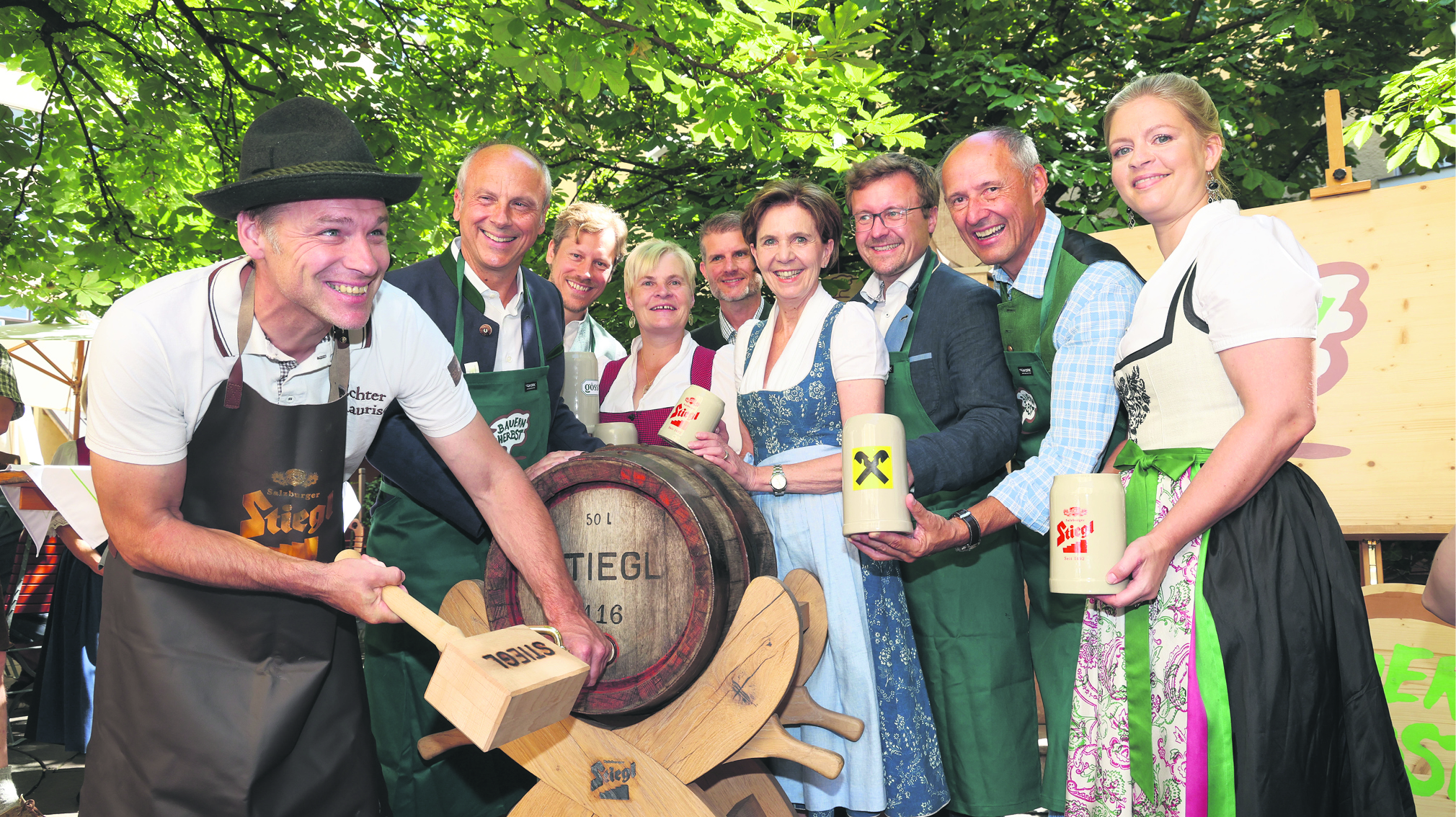 Foto 1: Beim traditionellen Bauernherbst-Bieranstich (v. l.): Peter Loitfellner (Bürgermeister der Bauernherbst-Gemeinde Rauris), Christian Pöpperl (Chefbraumeister der Salzburger Stieglbrauerei), Maximilian Gössl (Geschäftsführer Gössl), Claudia Entleitner (Vizepräsidentin der LWK Salzburg und Landesbäuerin), Florian Schwap (Salzburg Milch), Landtagspräsidentin Brigitta Pallauf, Christoph Bachleitner (Raiffeisen Salzburg), Leo Bauernberger (Geschäftsführer Salzburger Land Tourismus) und Eveline Bimminger (Projektleiterin Salzburger Bauernherbst). Foto: SLTG/Neumayr