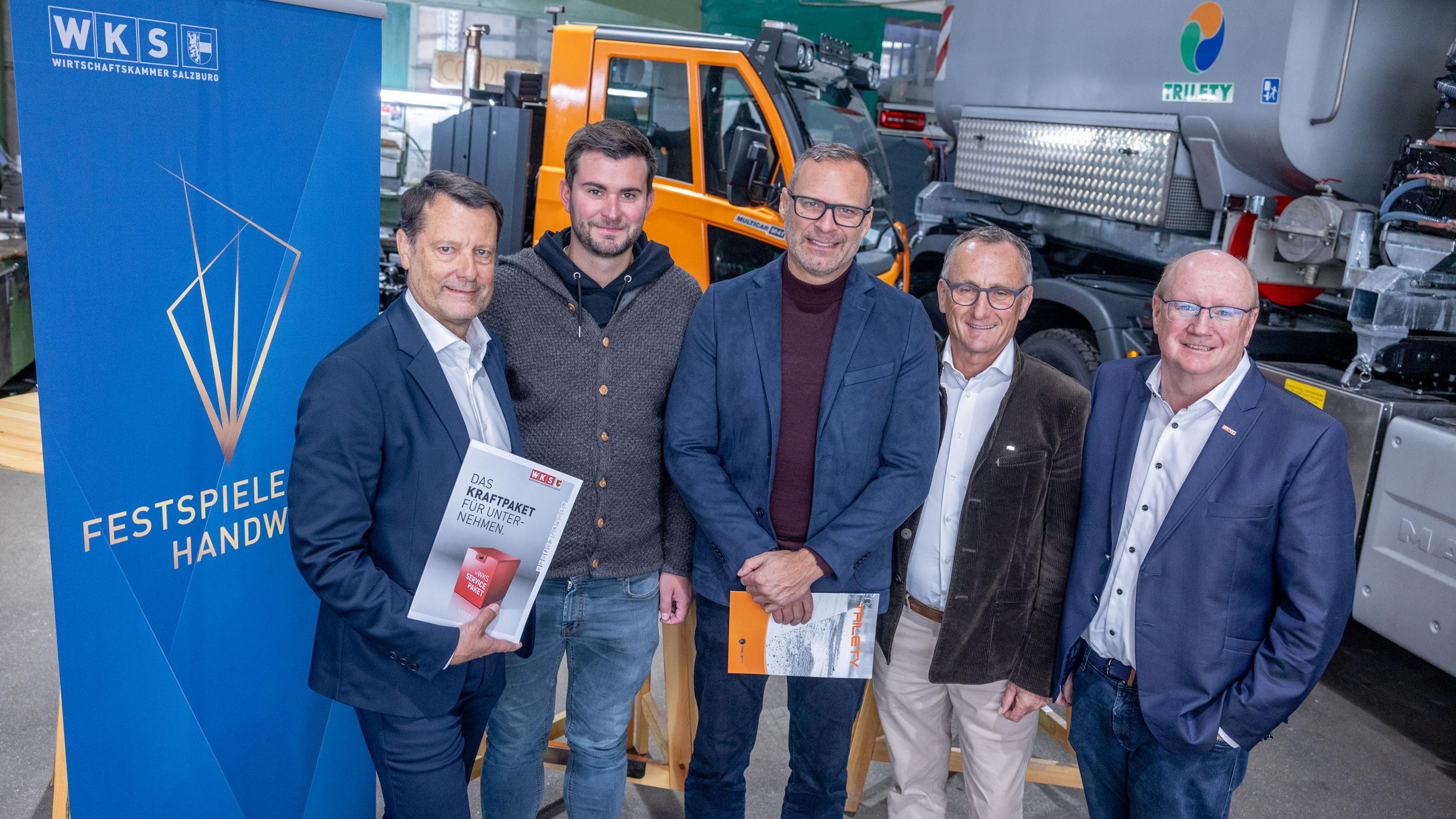 Foto 1: Bei der Präsentation der Preisträger (v. l.): Spartengeschäftsführer Wolfgang Hiegelsperger, Patrick Mayerhofer, Schlosserei Harasser (3. Platz), Stefan Trilety, Trilety GmbH (1. Platz), Walter Meiberger, Meiberger Holzbau GmbH (2. Platz), Spartenobmann Bernhard Seidl. © WKS/wildbild