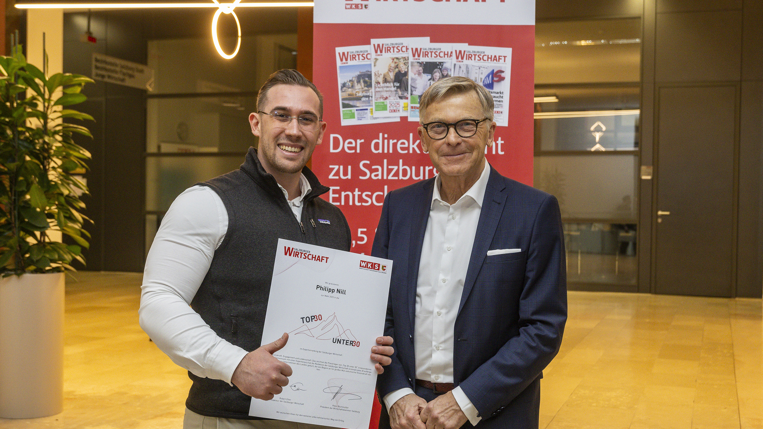 Foto: Top-Jungunternehmer im Pinzgau (v. l.): Philipp Nill (Nill Marketing Gmbh) und WKS-Präsident Peter Buchmüller. Nicht im Bild: Stephanie Riedmann (Designstudio 23).