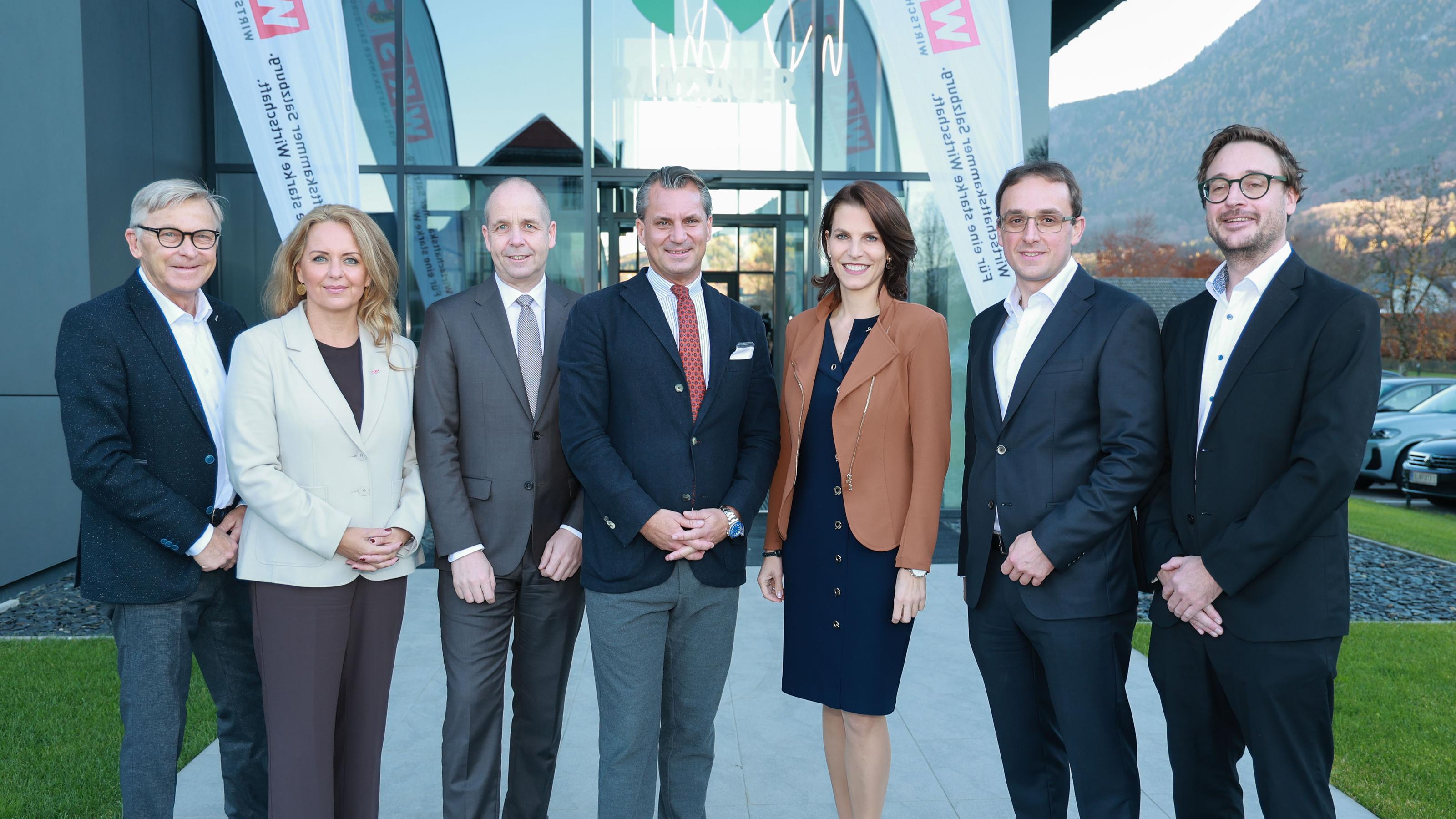 Foto 1: Sie sprachen über die schwierige Situation der Industrie (v. l.); WKS-Präsident Peter Buchmüller, Spartengeschäftsführerin Anita Wautischer, Ökonom Holger Bonin (IHS), Spartenobmann und IV-Präsident Peter Unterkofler, Landeshauptfrau Karoline Edtstadler und die beiden Ramsauer-Geschäftsführer Kornelius Kurz und Lukas Lingenhel.