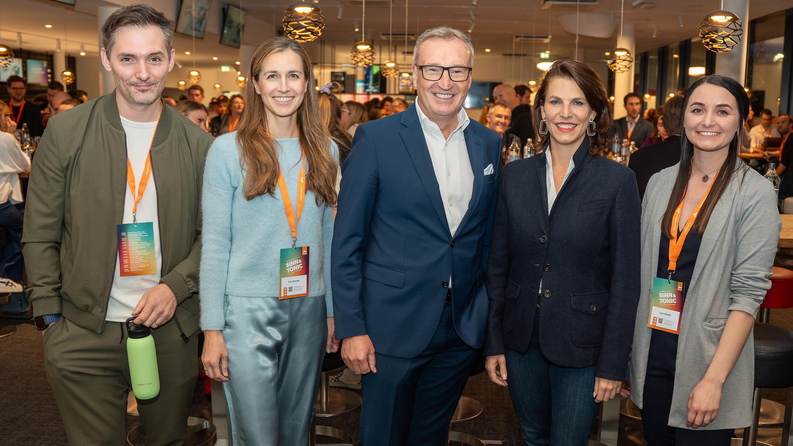 Foto 1: Waterdrop Co-Founder Henry Murray, Eva Mrazek, JW- Geschäftsführung, WKS-Präsident Manfred Rosenstatter, Landeshauptfrau Karoline Edtstadler und JW-Landesvorsitzende Lisa Rieder.