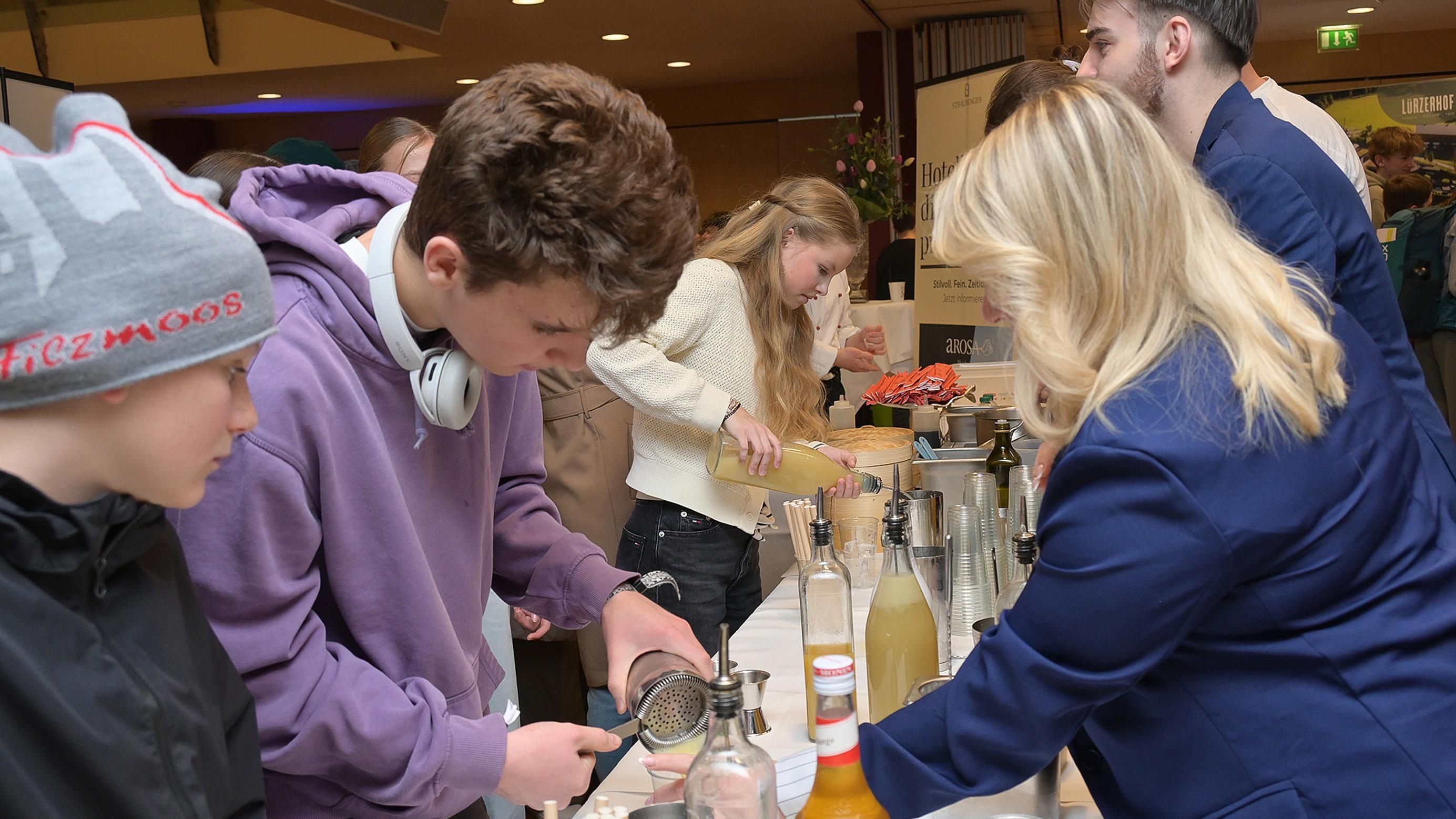 Gleichzeitig gab es an den Ständen der 21 Aussteller die Möglichkeit, selbst Hand anzulegen und diverse Tätigkeiten auszuprobieren. So konnten die anwesenden Schüler Cocktails shaken, aus Gemüse Dekorationen herstellen oder Gyoza-Teigtaschen befüllen, die dann vor Ort mit einem Chefkoch und seinem Team zubereitet wurden.