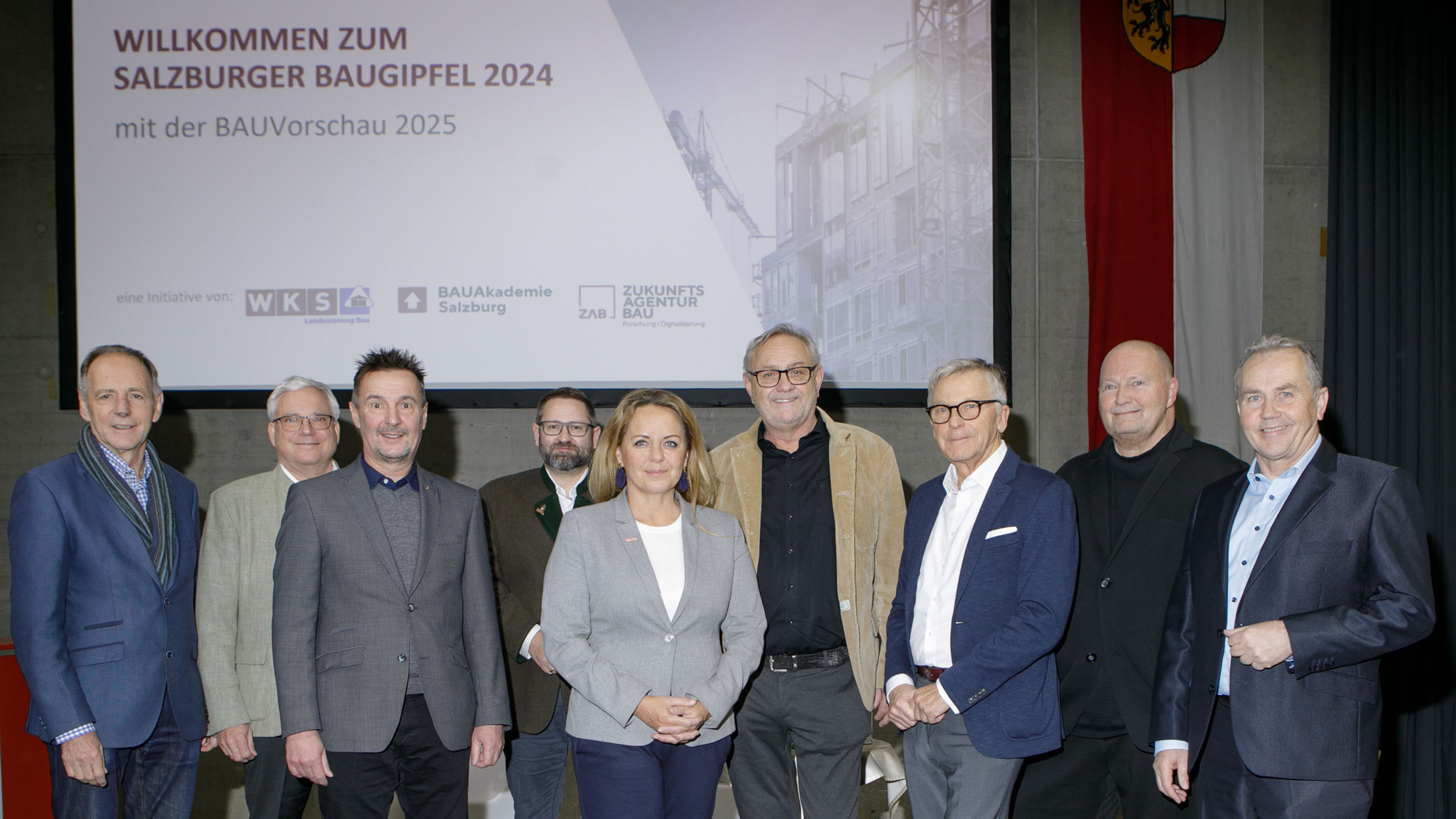 Foto 1: Beim Salzburger Baugipfel 2024 (v. l.): Gewerbe-Spartenobmann Josef Mikl, WKS-Direktor-Stv. Gerd Raspotnig, Landesrat Martin Zauner, LAbg. Wolfgang Mayer, Industrie-Spartengeschäftsführerin Anita Wautischer, Bau-Innungsmeister Peter Dertnig, WKS-Präsident Peter Buchmüller, Bau-Innungsgeschäftsführer Karl Scheliesssnig und Gemeindeverband-Vizepräsident Wolfgang Wagner.