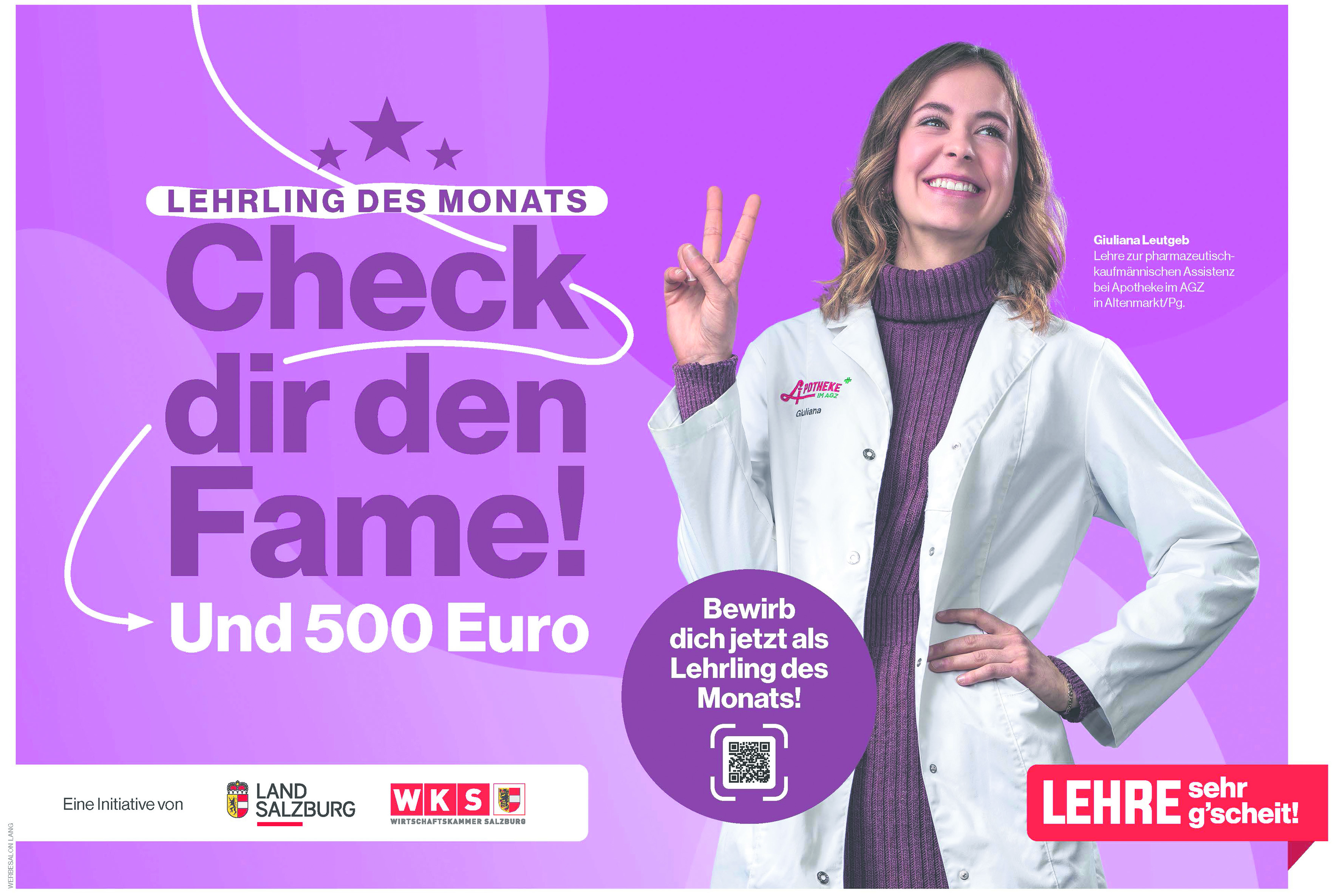 Im Folgejahr wird aus jenen zwölf „Lehrlingen des Monats“ der „Lehrling des Jahres“ gewählt. „Die Kandidat:innen können sich in einem Video vorstellen und dabei Ausschnitte aus ihrem spannenden Berufsalltag zeigen. Der ‚Lehrling des Jahres‘ wird im Rahmen einer eigenen Veranstaltung ausgezeichnet und erhält eine Geldprämie in Höhe von 2.000 €“, erklärt Martina Plaschke, in der WK Salzburg zuständig für Lehre – Strategie und Initiativen.