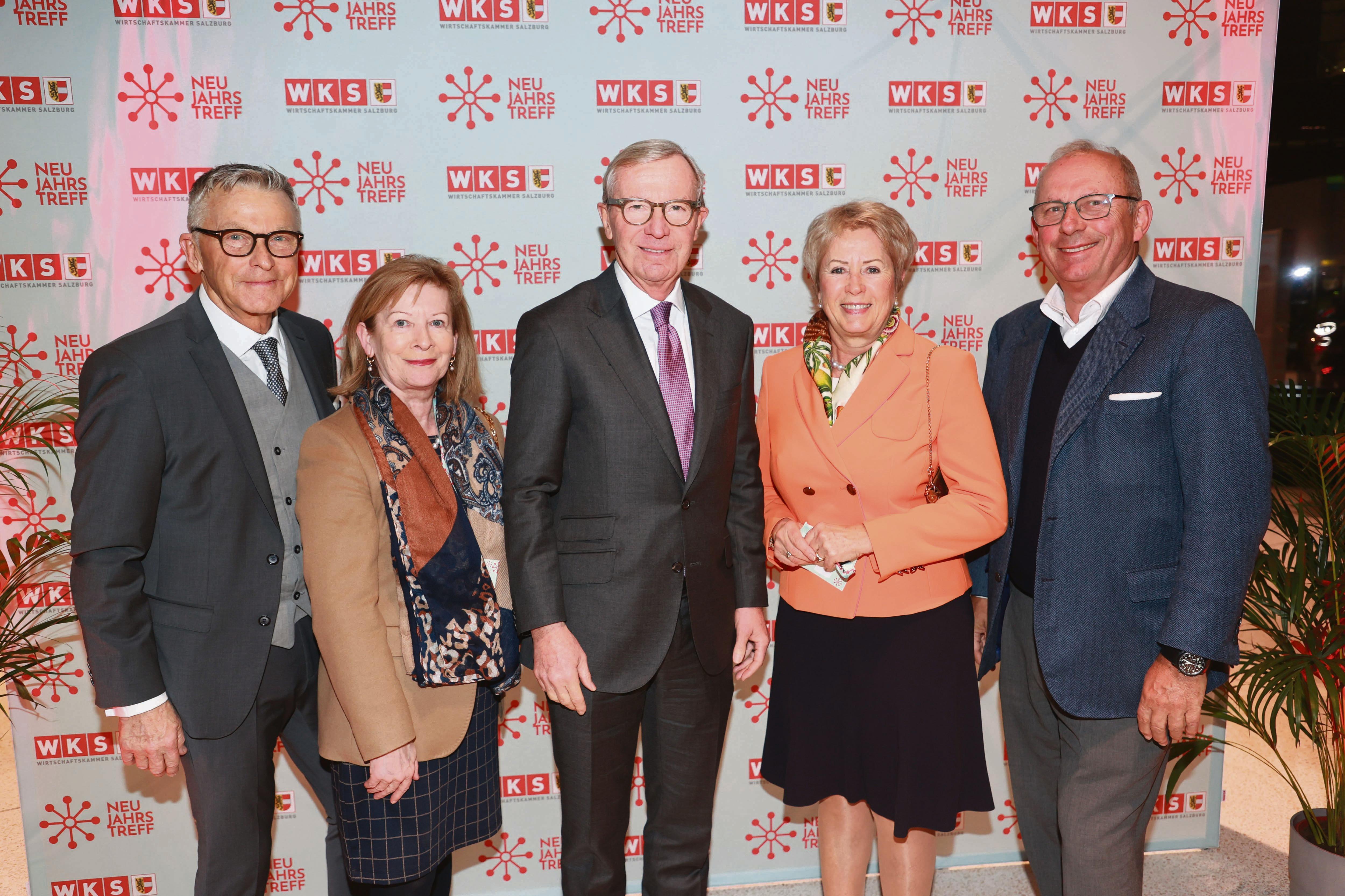 Bild 1: Beim zweiten WKS-Neujahrstreffen für die Unternehmer:innen aus der Stadt Salzburg und dem Flachgau (v. l.): WKS-Präsident Peter Buchmüller, WKS-Vizepräsidentin Marianne Kusejko, Landeshauptmann Wilfried Haslauer, WKS-Vizepräsidentin Andrea Stifter und Hans Peter Schützinger, Sprecher der Geschäftsführung der Porsche Holding. Foto: Neumayr