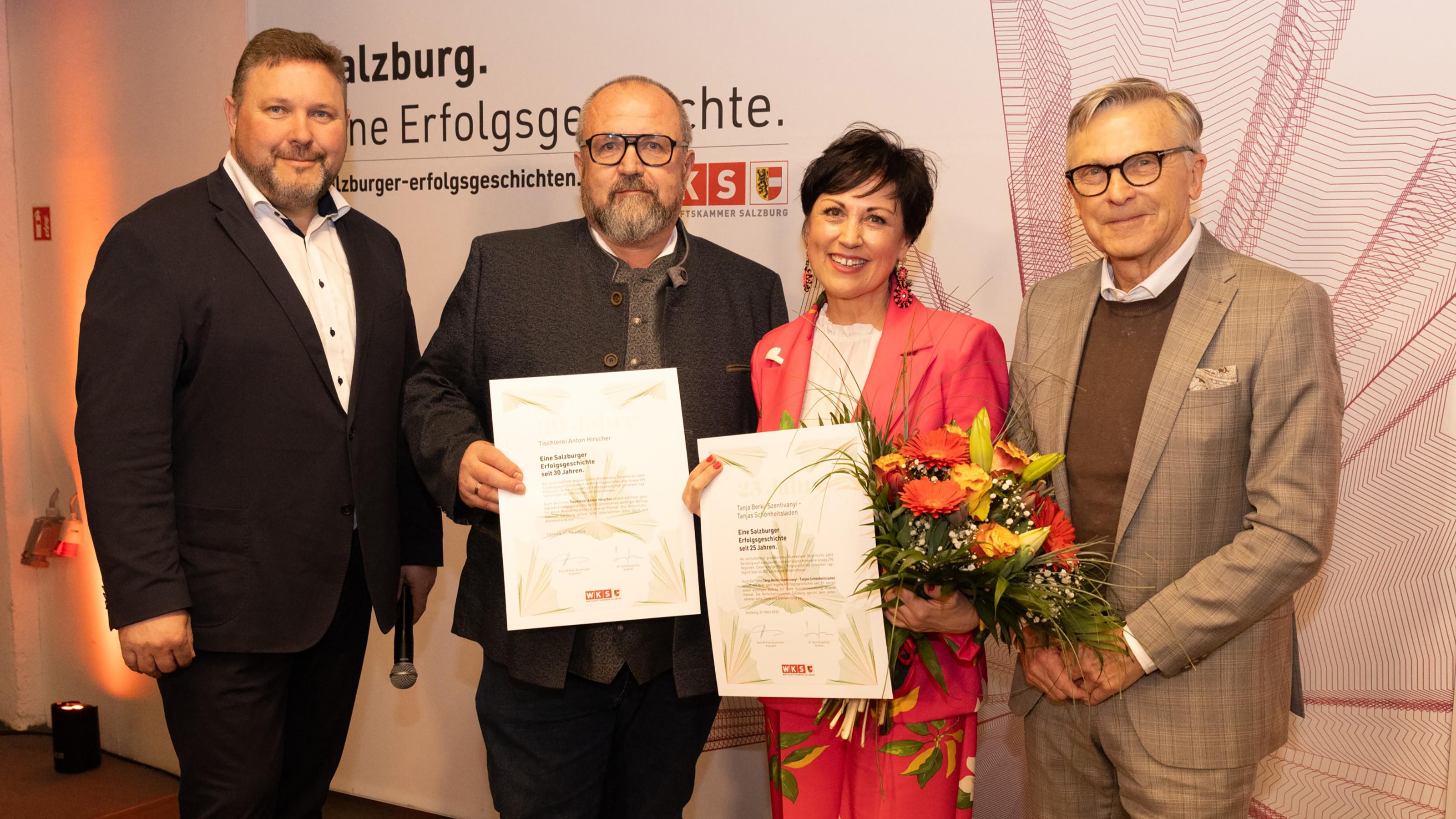 Foto: Bei der Auszeichnung der langjährigen Unternehmen im Tennengau (v. l): WKS-Bezirksstellenobmann Andreas Schnaitmann, Mst. Anton Hirscher, Tanja Angela Berki-Szentiványi und WKS-Präsident Peter Buchmüller. © WKS/Bernhard Moser