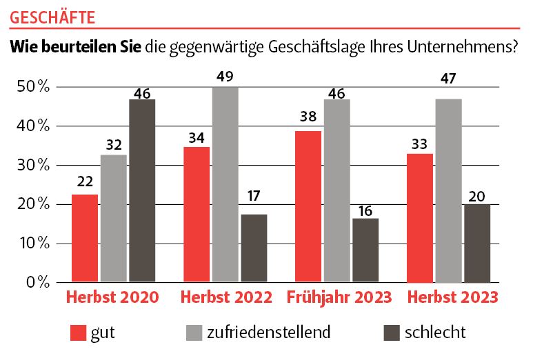 - Haben nur 16% der befragten Unternehmen die Geschäftslage der vergangenen sechs Monate als schlecht bewertet, so fällt der Blick in die Zukunft schon deutlich skeptischer aus. 27% der Befragten erwarten in den kommenden sechs Monaten eine schlechte Geschäftslage. Ein ähnliches Bild ergibt sich auch bei der Auftragslage, die signifikant eingebrochen ist. Knapp ein Drittel der Befragten rechnet mit einer schlechten bzw. zu geringen Auftragslage.