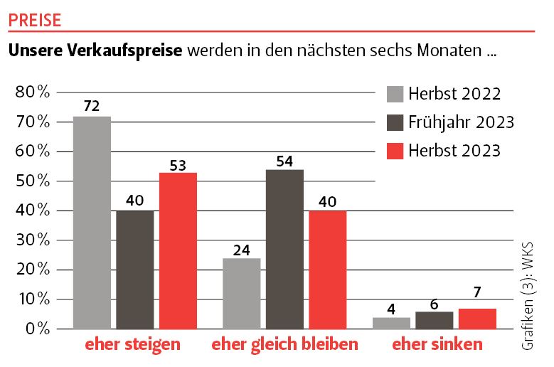 - Haben im Frühjahr noch 40% angegeben, die Verkaufspreise anheben zu müssen, gehen nun 53% von Preissteigerungen aus. „Verantwortlich dafür sind Zweitrundeneffekte durch die hohen Lohnabschlüsse, die erste Anzeichen für eine Lohn-Preis-Spirale sind. Während die Preisweitergabe für die im internationalen Wettbewerb stehende Industrie nur eingeschränkt möglich ist, besteht im Dienstleistungssektor dafür mehr Spielraum“, betont Fuchs.