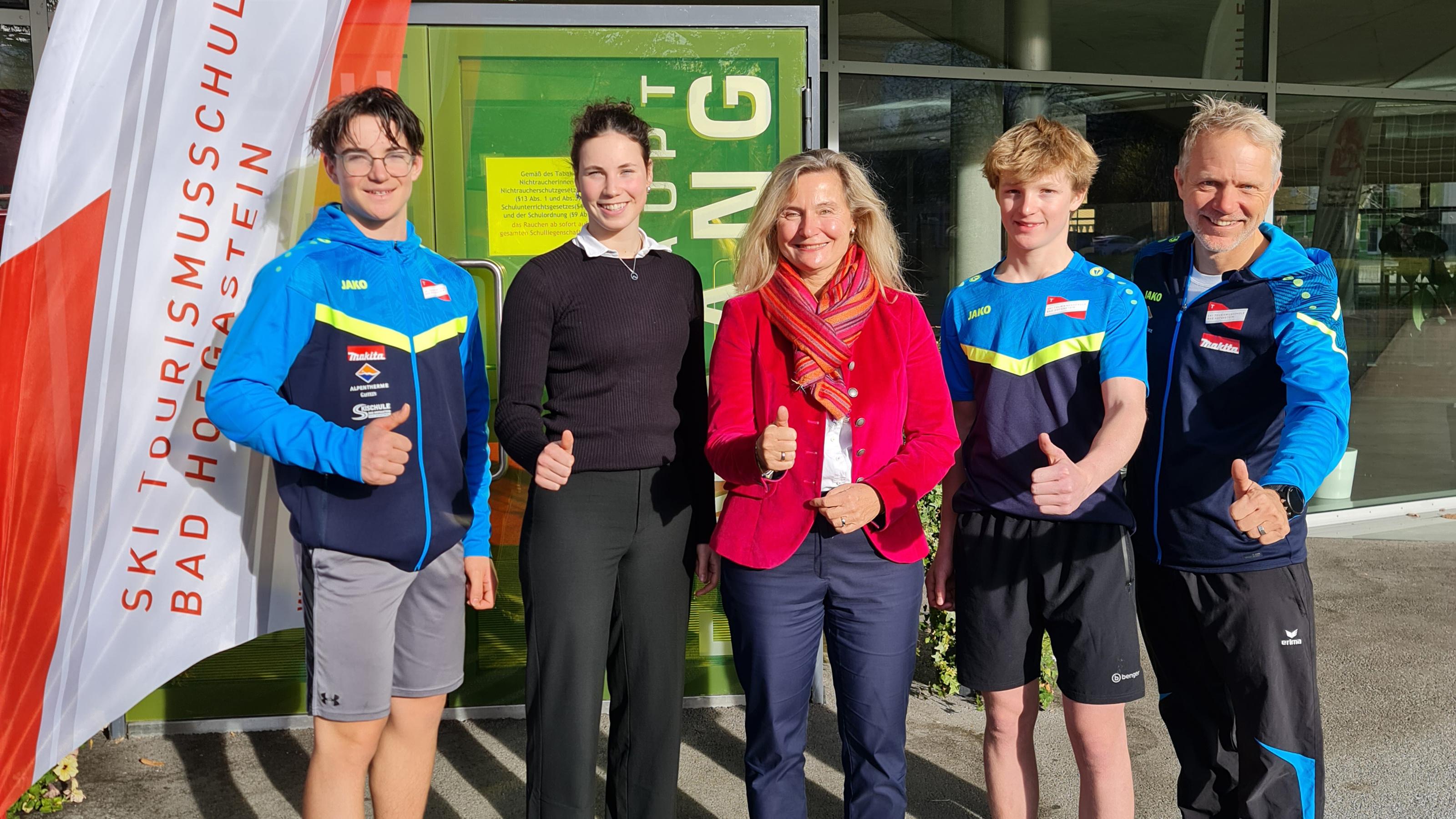 Foto 1: Die Nachwuchstalente der Skitourismusschule Bad Hofgastein (v. l.) Manuel Jäger, Christina Gruber und Tobias Zwisler mit ihrem skisportlichen Leiter Gernot Wagner (rechts) und ihrer Direktorin Maria Wiesinger (3. v. l.).