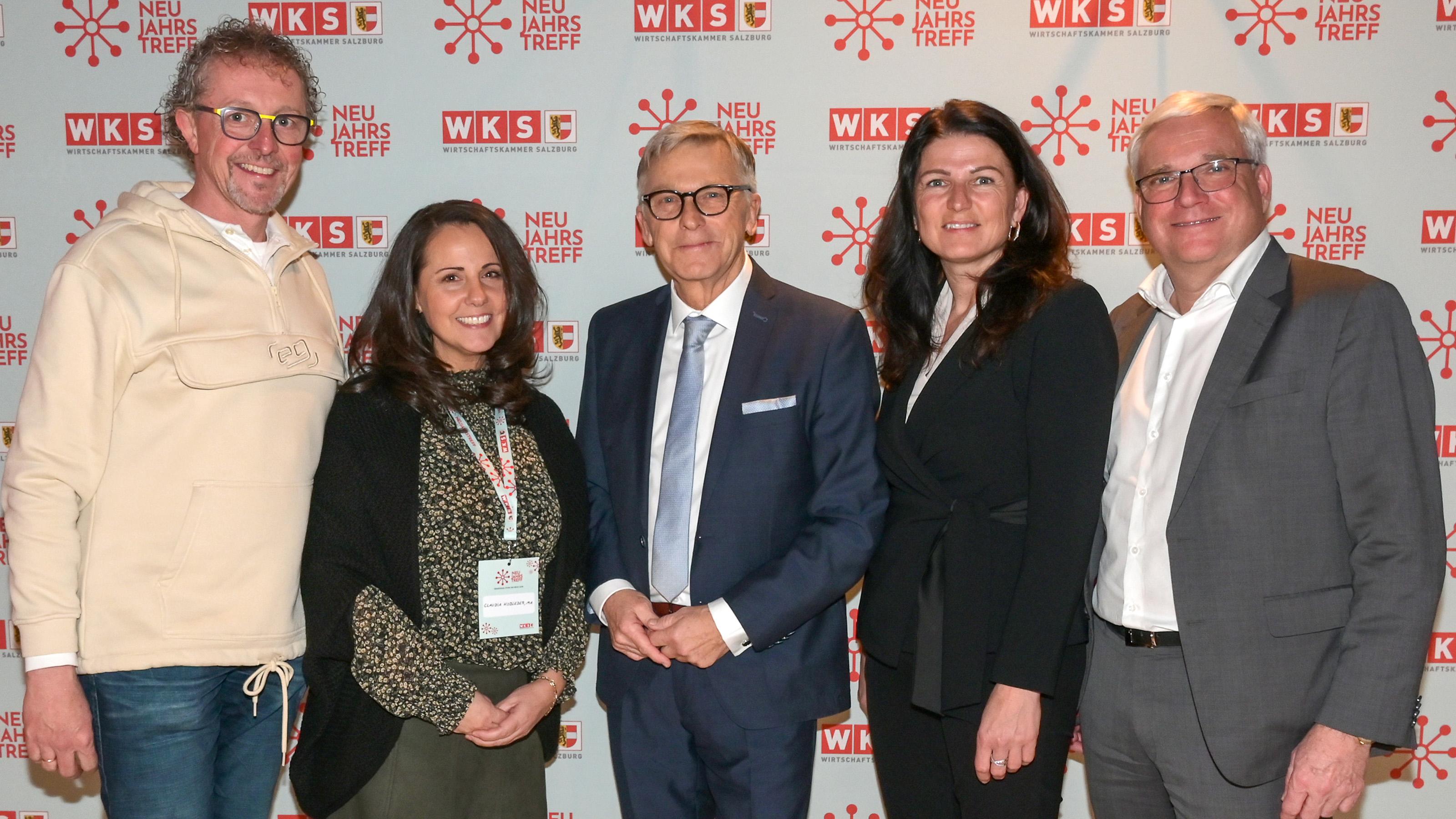 Bild: Beim Neujahrstreff im Schloss Goldegg (v. l.): Die Pongauer Unternehmer Thomas Wentz und Claudia Kobleder mit WKS-Präsident Peter Buchmüller, Bezirksstellenobfrau Elke Steinbacher sowie WKS-Direktor-Stv. Gerd Raspotnig.