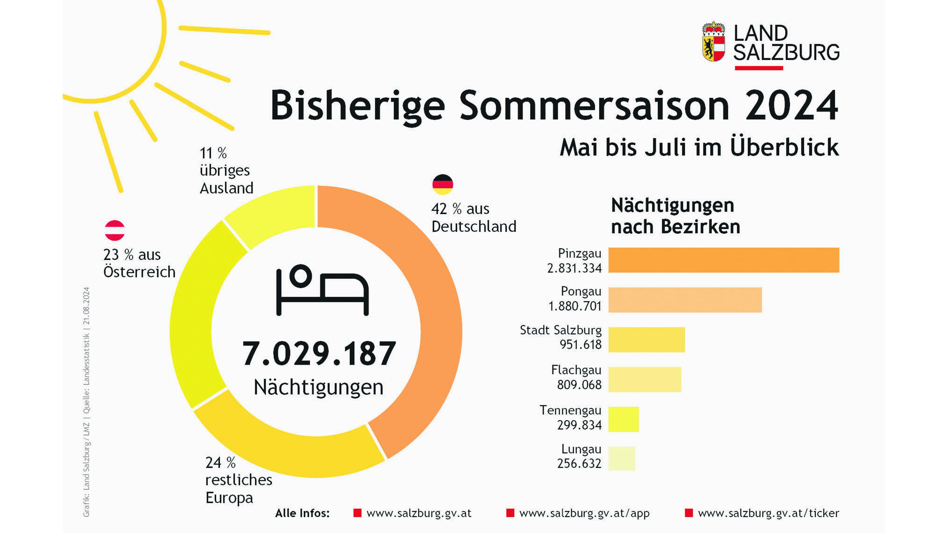 Der Tourismusmotor läuft im Bundesland Salzburg aktuell auf Hochtouren. 7,03 Millionen Nächtigungen von Mai bis Juli bedeuten das zweitbeste Sommer-Zwischenergebnis seit Aufzeichnungsbeginn.