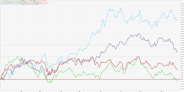 Zwischen den Marktsegmenten und Sektoren gibt es ebenfalls eine große Spreizung der Kursgewinne, SmallCap-Aktien etwa sind seit März abgeschlagen: Nasdaq +41 %, S&P500 +15 %, Russell 2000Y (in der Grafik rot) +6 % (USA).
