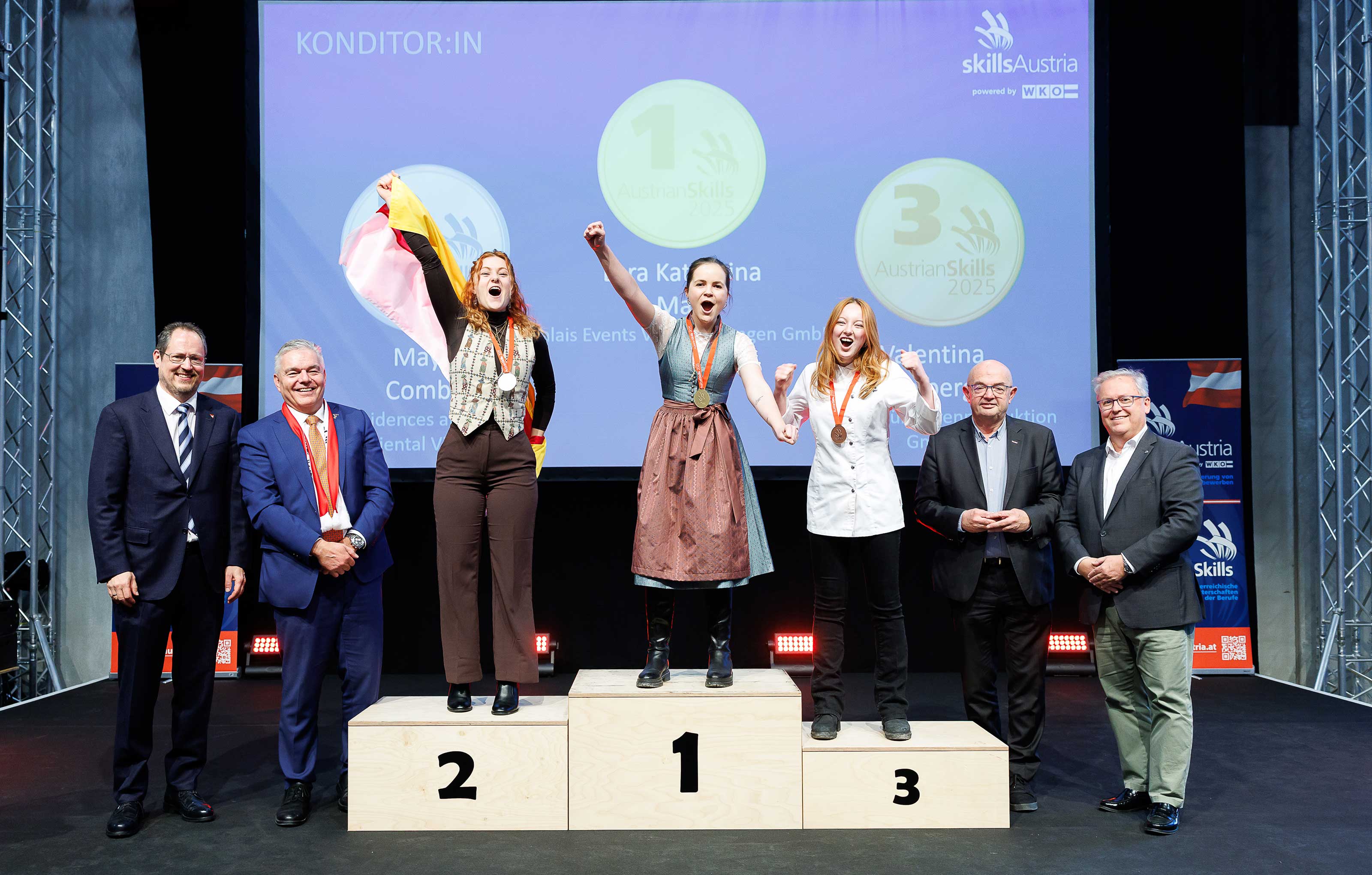 Vom 20. bis 22.11.2025 fanden im Messezentrum Salzburg die AustrianSkills 2025 statt. Bei der feierlichen Siegerehrung am 23.11.2025 wurden die Teilnehmer:innen von über 2.500(!) Gästen begeistert gefeiert. Damit ging die Premiere von acht jungen Konditorinnen im Rahmen der Salzburger Berufsbildungstage nach drei intensiven Wettbewerbstagen erfolgreich zu Ende.