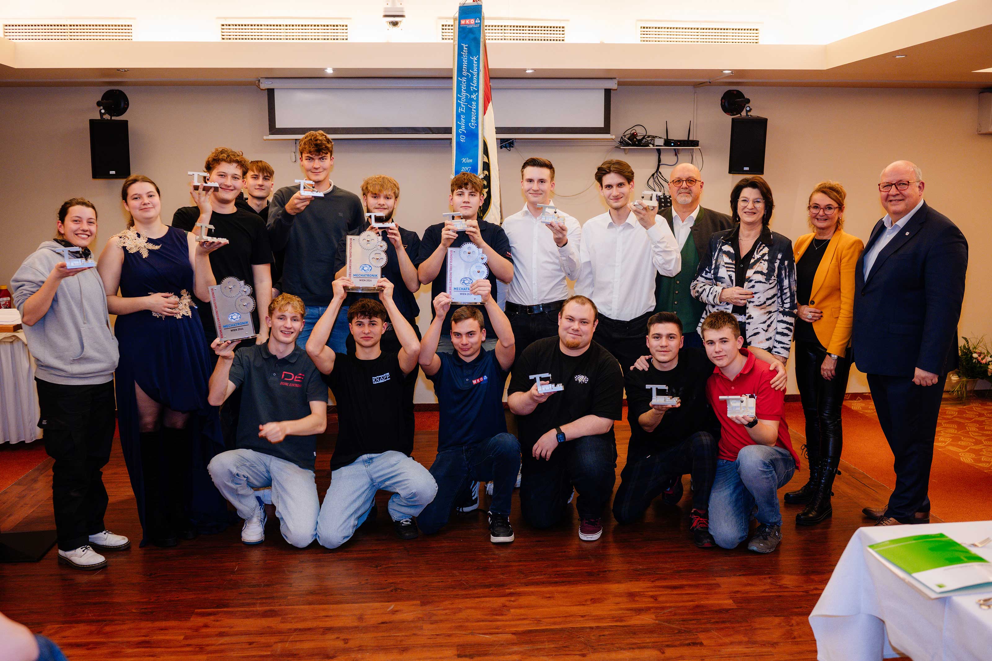 © Walter Skokanitsch 1. Reihe von links nach rechts: Michael Mühlbacher (S), Til Kleindienst (ST), Massimo Grill (ST), Raphael Gröbner (NÖ), Leo Trautenberger (OÖ), Andreas Mielacher (OÖ); 2. Reihe von links nach rechts: Elena Gal (W), Vanessa Schöbinger (W), David Herbst (ST), Florian Repper (NÖ), Lukas Leitner (NÖ), Tobias Macho (NÖ), Julian Schmidl (B), Maximilian Neureiter (S), Jannik Hörmann (S), Andreas Kandioler (Bundesinnungsmeister), Maria Neumann (Wiener Spartenobfrau vom Gewerbe und Handwerk), Elisabeth Rammel (Spartengeschäftsführerin), Peter Merten (Wiener Landesinnungsmeister).