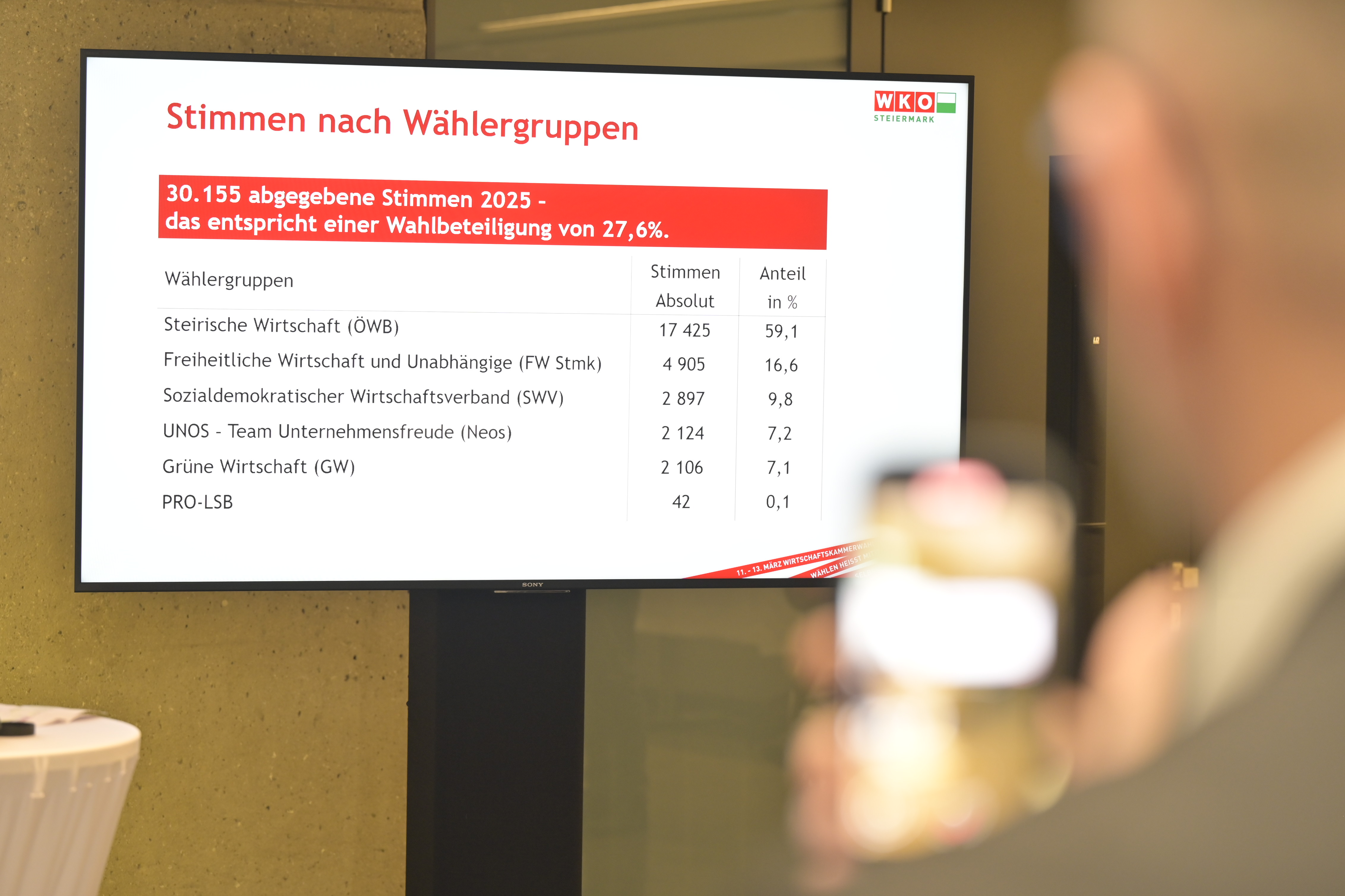 30.155 Stimmen wurden bei der steirischen Wirtschaftskammerwahl 2025 abgegeben, das entspricht bei 109.307 Wahlrechten einer Wahlbeteiligung von 27,6 Prozent. In absoluten Zahlen ist das ein Minus von 6.464 Stimmen gegenüber der letzten Wahl im Jahr 2020, wo die Beteiligung – aufgrund der geringeren Zahl von Mitgliedern – 38 Prozent betrug. Bei der am 14. März erfolgten Auszählung entfielen 17.425 Stimmen auf den Wirtschaftsbund, der damit seine Mehrheit mit 59,1 Prozent klar verteidigt. Im Vergleich zur letzten Wahl stellt das ein Minus von 8.101 Stimmen dar. Trotzdem ist die Fraktion des amtierenden WKO Steiermark Präsidenten Josef Herk mit 687 von 1.116 möglichen Gesamtmandaten weiterhin die mit Abstand stärkste Fraktion.