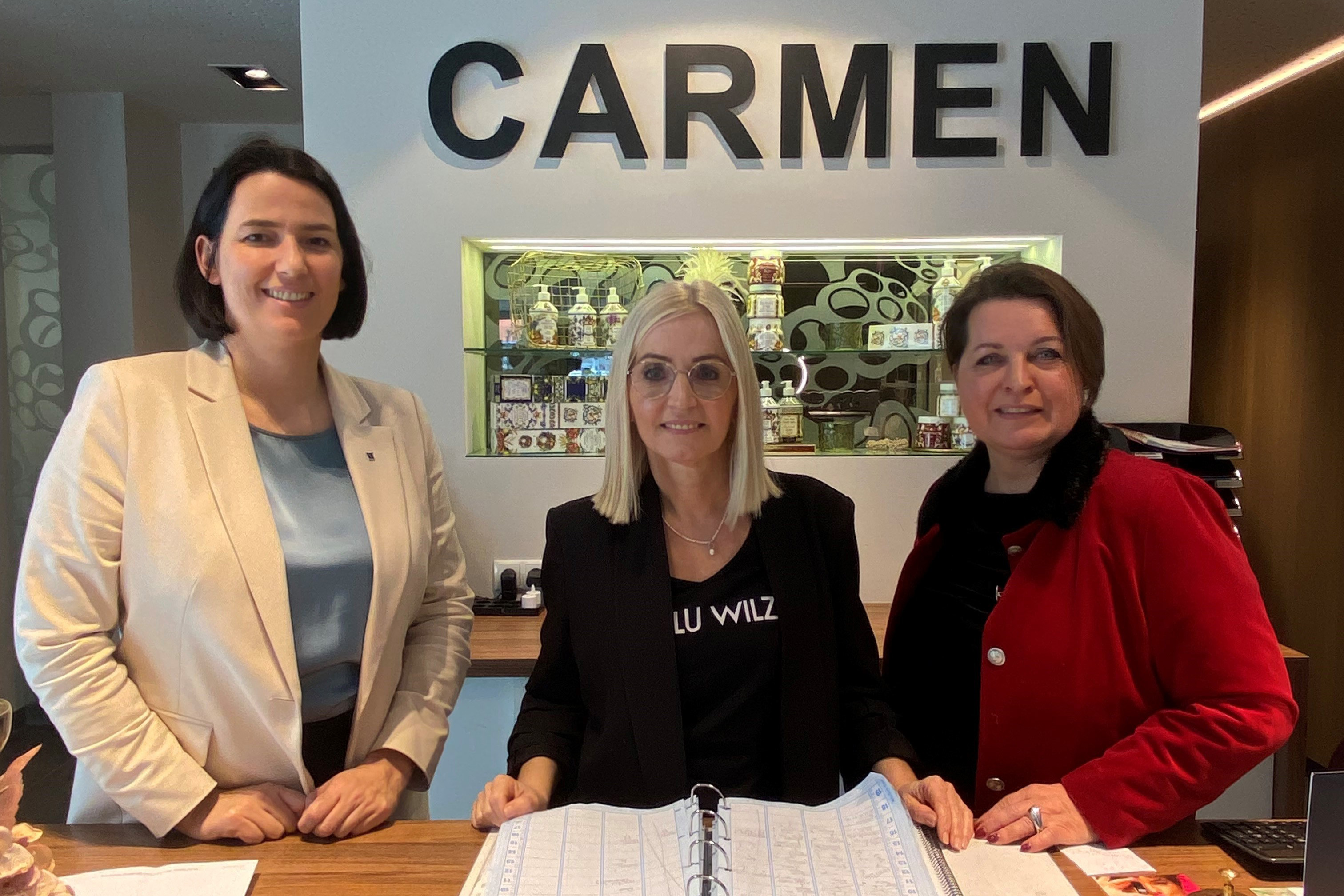 Anschließend ging es weiter zum „Kosmetikstudio Carmen“ in Zams. Barbara Thaler zeigte sich beeindruckt vom breiten Angebot an Pflege- und Schönheitsbehandlungen und gratulierte Carmen Wilhelm gemeinsam mit Petra Erhart-Ruffer, FiW-Bezirksvorsitzende und Ausschussmitglied der Landesinnung der Fußpfleger, Kosmetiker und Masseure, zu ihrem langjährigen Erfolg.
