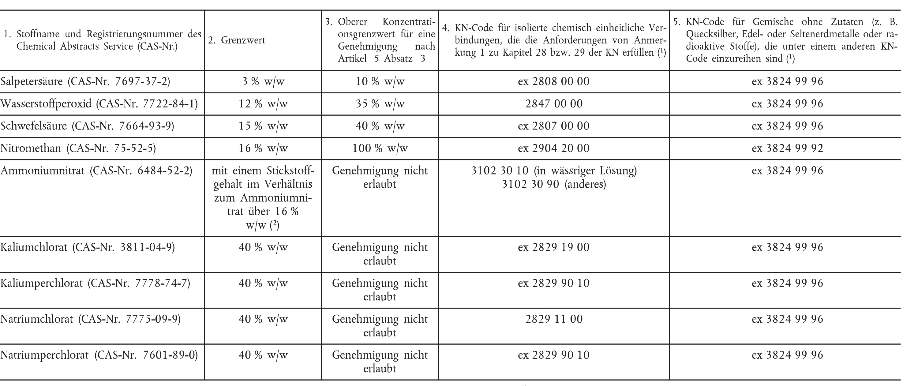 Die Abgabe von Ammoniumnitrat, Kaliumchlorat, Kaliumperchlorat, Natriumchlorat und Natriumperchlorat ist ausschließlich bis zum Grenzwert in Spalte 2 möglich und darüber hinaus nicht erlaubt.