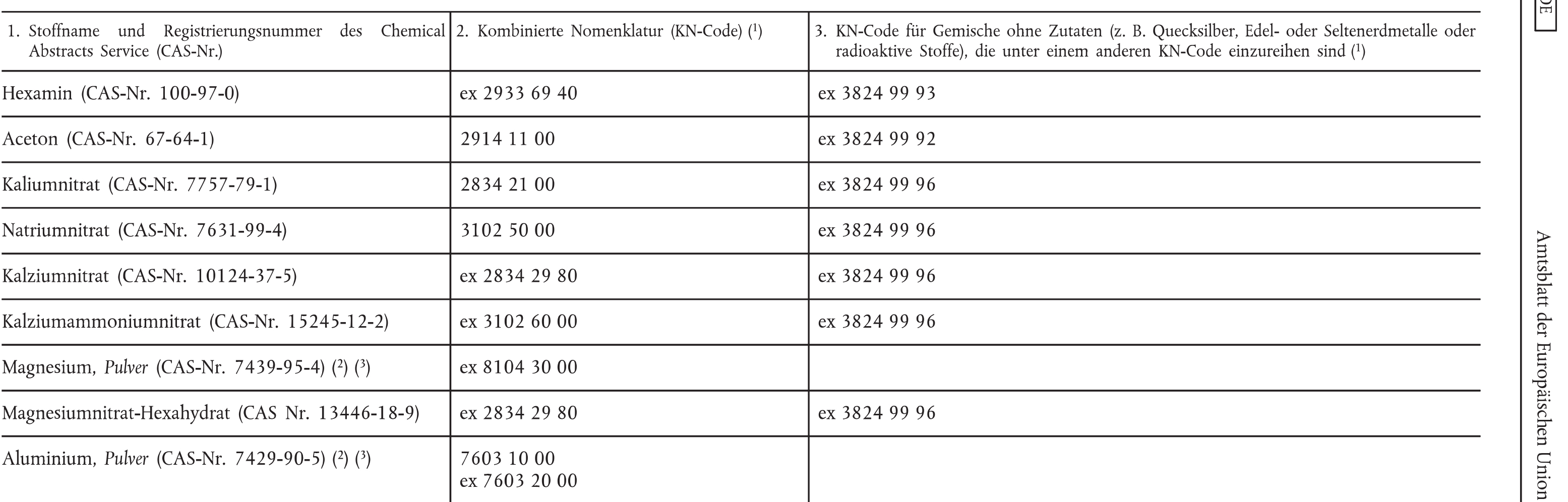 Klarstellung zu Ammoniumnitrat: gemeint sind Produkte mit einem Stickstoffgehalt von 16 % im Verhältnis zum Ammoniumnitrat (entspricht einem Gehalt von 45,7 % Ammoniumnitrat).
