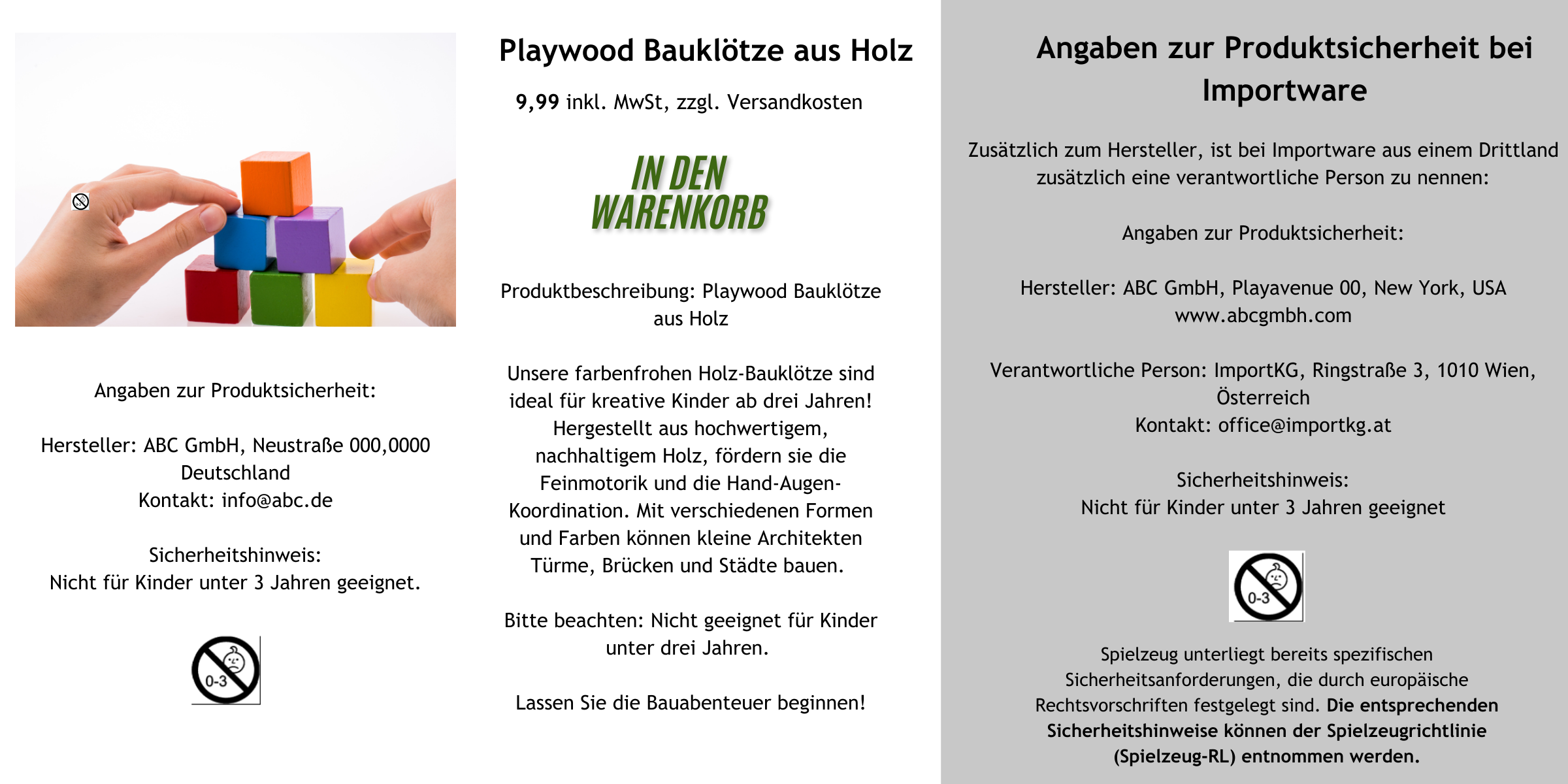 Die Warn- und Sicherheitshinweise müssen eindeutig und gut sichtbar im Angebot der Produkte enthalten sein. Daher sollten diese Informationen gut sichtbar auf der Produktdetailseite eingebunden werden.
